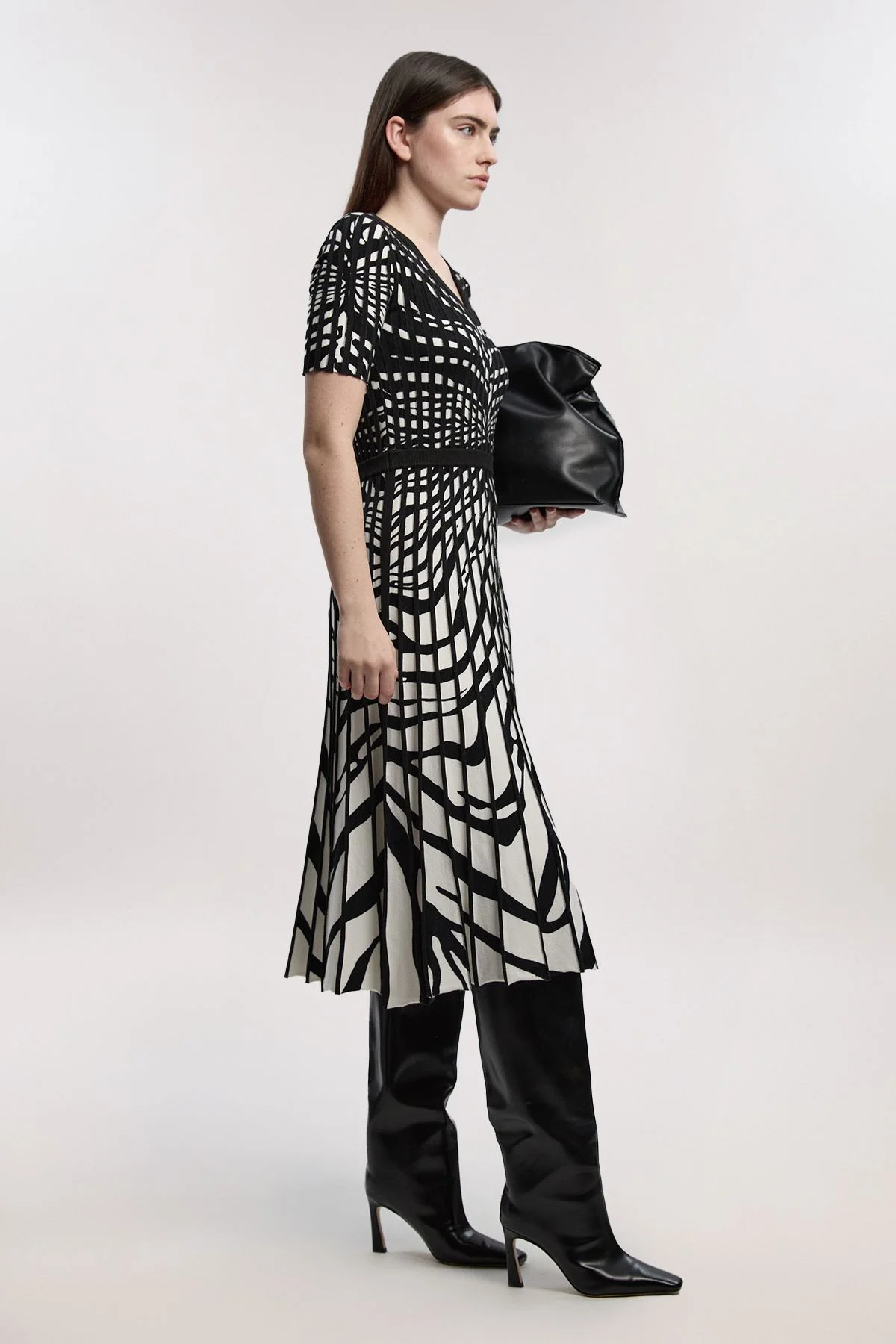 - Striking zebra jacquard knit pattern that creates a captivating visual effect from bodice to hem - Full skirted silhouette that gracefully flares out for elegant movement - Short sleeves provide versatility for transitional weather styling - Midi length design offering sophisticated coverage and contemporary proportion - Defined waistline that accentuates the feminine silhouette This jacquard knit midi dress showcases exceptional craftsmanship with its distinctive zebra pattern that creates a mesmerising gradient effect. The design transitions beautifully from structured bodice to flowing full skirt, creating a silhouette that's both refined and dramatic. Style with knee-high boots and an oversized clutch for an elevated daytime look that transitions effortlessly to evening occasions. For corporate settings, layer with a tailored blazer and pointed court shoes. The viscose-blend fabric offers comfortable wear whilst maintaining structure throughout the day. This piece works brilliantly for gallery openings, sophisticated brunches, or upmarket social gatherings where making a subtle statement is essential. The versatile design allows for customisation with jewellery-opt for minimalist pieces to let the dress's artistic pattern command attention. Product Details & Care Main: 39% Polyester, 34% Viscose/Rayon, 25% Nylon, 2% Elastane/Spandex. Machine wash. Model wears UK size small. Model height: 5"9. Length approx: 115cm
