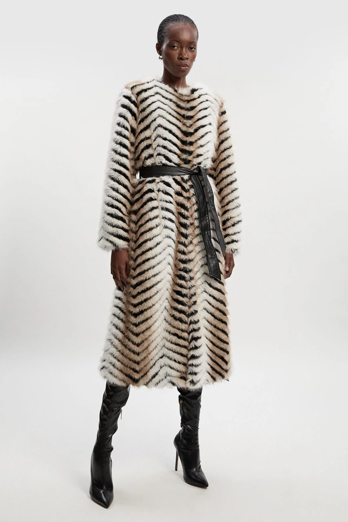 Make a bold impression with this eye-catching zig zag faux fur coat from Karen Millen. The collarless design creates a contemporary aesthetic that works for daytime occasions. The included belt cinches the waist for a flattering silhouette, whilst the generous length offers both style and practicality.This versatile piece transitions effortlessly from autumn through winter, making it a valuable addition to your outerwear collection that combines fashion-forward design with everyday wearability. Striking zig zag pattern faux fur texture Collarless design Belted waist detail Long length Regular fit Product Details & Care Faux fur main: 100% Polyester. Lining: 100% Polyester . Trim: Polyurethane. Backing: 73% Polyester, 27% Viscose/Rayon. Model wears: UK8 / US4. Model height: 5"9. Approx length: 125cm