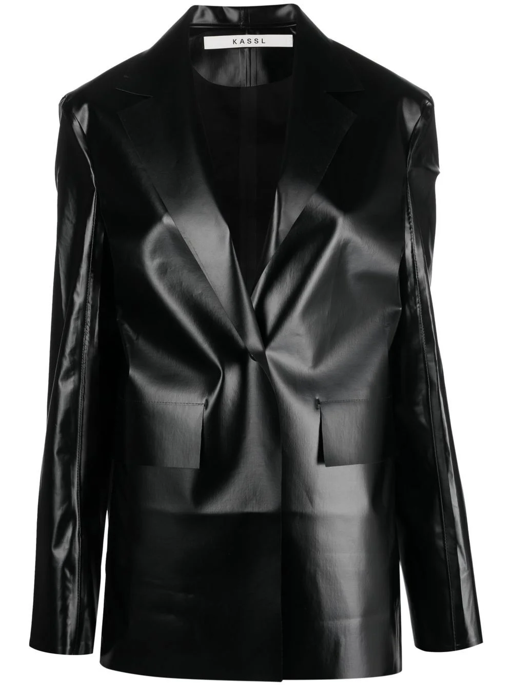 high-shine single-breasted blazer black faux leather high-shine finish front button fastening two front flap pockets notched lapels long sleeves straight hem Imported Composition Polyurethane 61%, Cotton 39% SIZE & FIT Model measurements Height 5 ft 8 in(1.73 m) Bust/Chest 33.07 in(84 cm) Hips 35.03 in(89 cm) Waist 24.8 in(63 cm) Measurement SLEEVE LENGTH 24.01 in(61 cm) LENGTH 29.92 in(76 cm) WAIST 42.51 in(108 cm) BUST 44.09 in(112 cm) Shoulder Width 16.53 in(42 cm) FittingInformation This piece fits true to size. We recommend you get your regular size Cut for a loose fit Made with a mid-weight non-stretch fabric Washing instructions Dry Clean Only