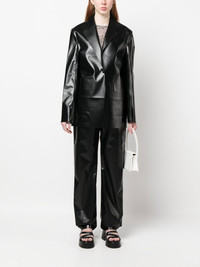 high-shine straight-leg trousers black faux leather high-shine finish straight leg high-waisted elasticated waistband two diagonal pockets to the sides Imported Composition Outer: Polyurethane 61%, Cotton 39% Lining: Cotton 100% SIZE & FIT Model measurements Height 5 ft 8 in(1.73 m) Bust/Chest 33.07 in(84 cm) Hips 35.03 in(89 cm) Waist 24.8 in(63 cm) FittingInformation This piece fits true to size. We recommend you get your regular size Designed to be fitted at the waist, loose over the leg Made with a mid-weight non-stretch fabric Washing instructions Dry Clean Only