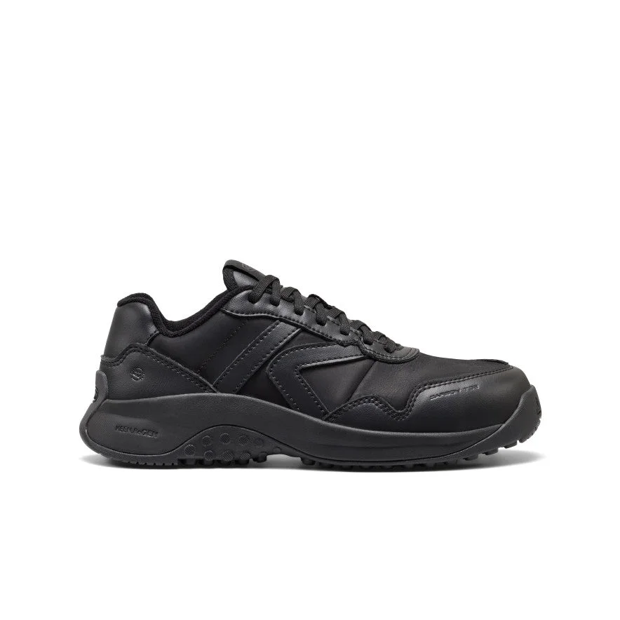 Throwback trail runner design made workday-ready with an all-leather upper. This ultra-light, carbon-toe work sneaker features energy-returning KEEN.ReGEN cushioning and a women's-specific fit. Product Details STYLE NUMBER: 1032278 WEIGHT PER SHOE: 14.6oz / 414g SHAFT HEIGHT: 2.56in / 65mm HEEL HEIGHT: 1.06in / 27mm HEEL-TO-TOE DROP: 0.39in / 10mm DUTY TYPE: Light Features - Heat-resistant rubber outsole rated up to 572°F/300°C - 100% non-metallic construction for easily passing through metal detectors in highly-secured areas - Non-mutilating upper reduces the chance of marking or scratching surfaces - Cement construction for flexible, lightweight performance. - Eco Anti-Odor for natural, pesticide-free odor control - Nylon shank for midfoot support - Environmentally preferred premium leather from LWG-certified tannery for cleaner water Materials - KEEN.ReGEN lightweight, compression-resisting midsole providing up to 50% energy return with every step - Oil- and slip-resistant non-marking rubber outsole - Electrical hazard (EH) or Electric Shock Resistant (ESR) footwear helps provide a secondary source of protection in case of accidental outsole contact with live electrical circuits - Water resistant leather provides a barrier against liquid absorption and helps preserve the quality of the leather over time - Removable metatomical insole for comfort and support - Leather Thickness: 1.60-1.80mm - Mesh liner provides breathability to help keep feet cool in warm environments Care - Gently brush with a soft, damp sponge to remove loose dirt. Treat stains right away with a gentle cleaner. Safety Features - Left and right asymmetrical, non-metallic carbon toes offer unobtrusive fit and are 15% lighter than steel - Meets ASTM F3445-24 and F2413-18 F I/75 C/75 EH standards - Meets ASTM F2913-24 SATRA non-slip testing standards - Meets ASTM F1677-96 Mark II non-slip testing standards - Outsole and midsole meets ASTM D471-06 903# oil and isooctane chemical resistance standards