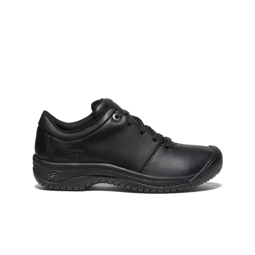 Get all-day comfort on the job, plus water resistance, wipe-clean convenience, and a plush footbed with this low-profile women's work shoe. Product Details STYLE NUMBER: 1006999 WEIGHT PER SHOE: 12.49oz / 354g SHAFT HEIGHT: 4.02in / 102mm HEEL HEIGHT: 0.85in / 21mm HEEL-TO-TOE DROP: 0.47in / 12mm DUTY TYPE: Service Features - KEEN.WET TRAX outsole quickly channels liquids to maximize surface area contact - Non-mutilating upper reduces the chance of marking or scratching surfaces - Shank for midfoot support - Environmentally preferred premium leather from LWG-certified tannery for cleaner water - PFAS-free, durable water repellent repels water just as well as forever chemicals without harming the planet Materials - Compression molded EVA midsole for comfort - Oil- and slip-resistant non-marking rubber outsole - Water resistant leather provides a barrier against liquid absorption and helps preserve the quality of the leather over time - Removable metatomical insole for comfort and support - Metal Hardware - Leather Thickness: 1.60-1.80mm Care - Gently brush leather with a soft bristle brush or hand towel to remove loose dirt and debris. Tough stains may require a leather cleaner. Safety Features - Left and right asymmetrical soft toes help safeguard against minor impact, but are not reinforced with a secondary crush resistance - Meets ASTM F1677-96 Mark II non-slip testing standards - Outsole and midsole meets ASTM D471-06 903# oil and isooctane chemical resistance standards