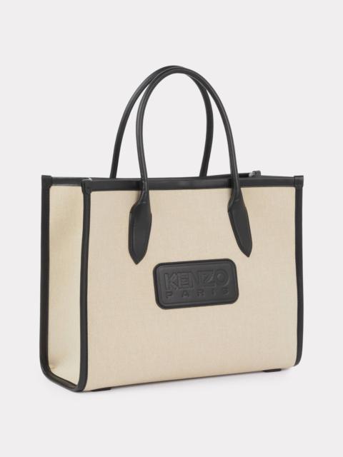 This large tote bag combines a generous size with stylish detailing. The KENZO Paris logo is embossed on an elegant leather badge. This practical bag also has an inner pocket and card slot. 'KENZO 18' large canvas and leather tote bag. KENZO Paris logo embossed on leather badge. Two handles. Hook. One inner zip pocket. One inner card holder. Product Reference: FE52SA211B01.99.TU SIZE & FIT Dimensions: 41 x 32 x 16 cm.Handle height: 16 cm.Carry on the shoulder. COMPOSITION & CARE Made in Spain 60% cotton, 40% polyester Do not bleach Do not dry-clean Do not iron Do not dry Do not tumble dry Do not wash Do not wet-clean