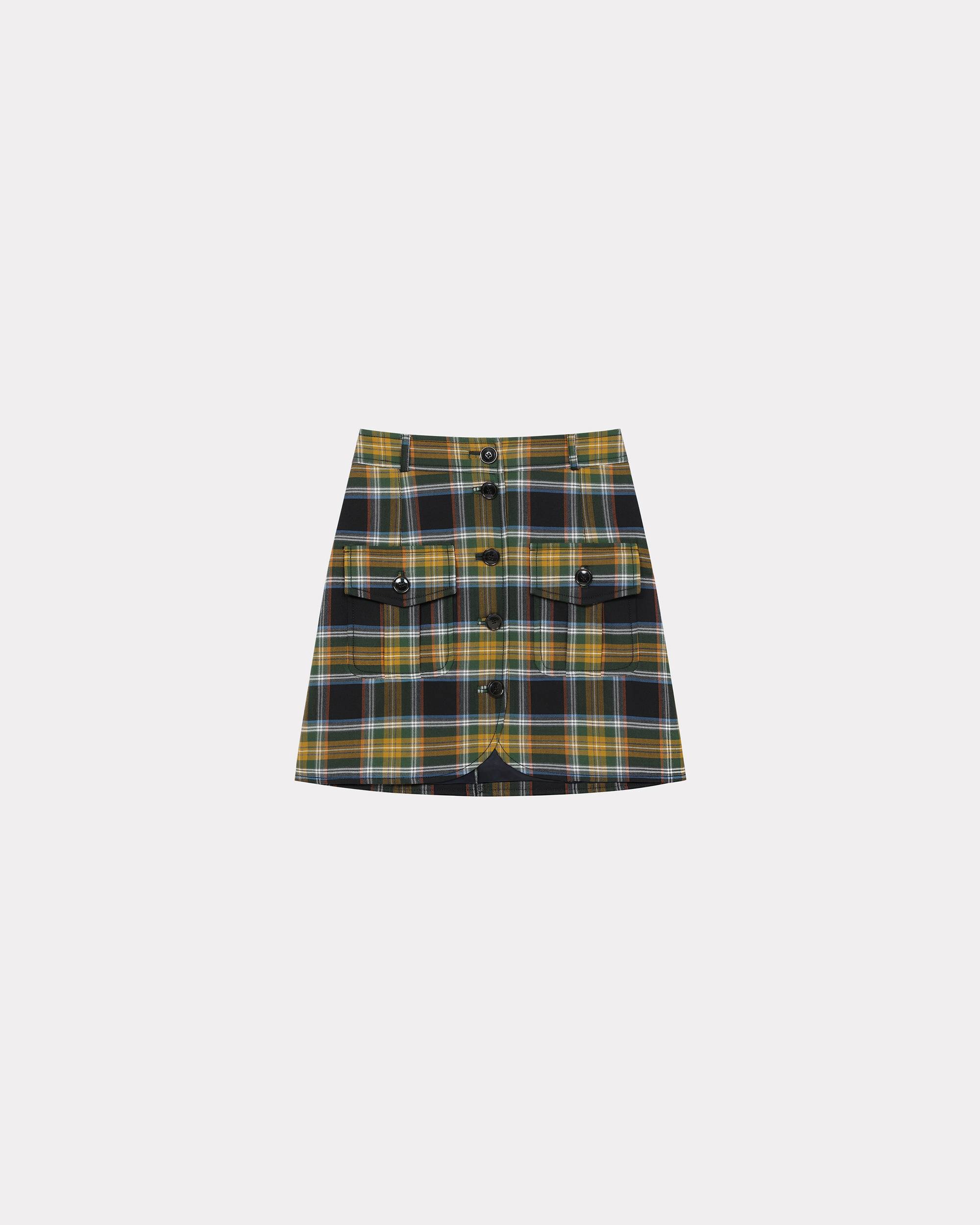 This mini skirt, with its checked print, takes its inspiration from 1960s English aristocratic elegance. This practical piece has two meticulously designed flap pockets and fastens with a single row of buttons for smart retro style. A-line checked mini skirt. Two front flap pockets with buttons. Belt loops. Slit at the back. Front button fastening. SIZE & FIT Length at back: 42 cm. The model is 175 cm tall and wears a size S. COMPOSITION & CARE Made in Portugal 53% polyester, 43% virgin wool, 4% elastane