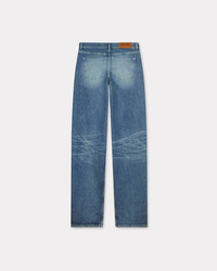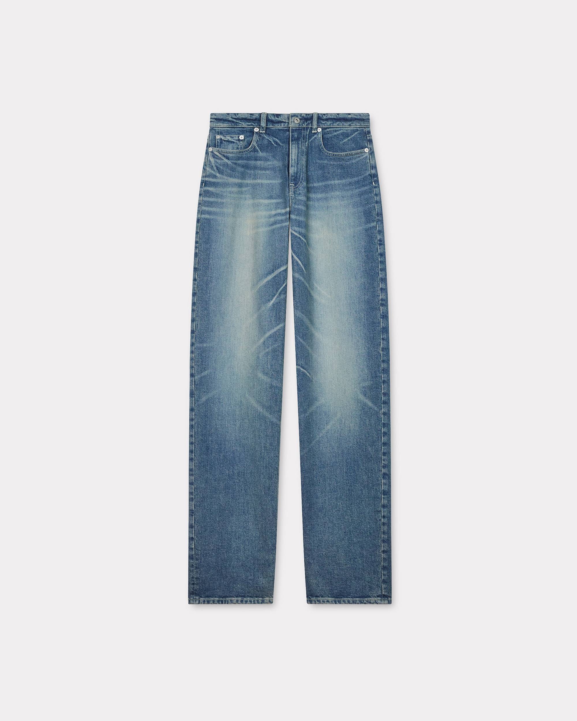ASAGAO regular fit jeans dirty concept. Stretch fabric. Dirty stone bleach. Japanese denim. Contrasted topstitches. 'KENZO Paris' leather jacron at back. Engraved buttons. Mont Fuji topstitches at back pockets. Product Reference: FE62DP2166S7.DY SIZE & FIT The model is 175 cm tall and wears a size S. Leg length at 107 cm. Regular waist. COMPOSITION & CARE Made in Tunisia 98% cotton, 2% elastane Do not bleach Mild professional dry-cleaning in: hydrocarbons Iron at low temperature Line drying in the shade Do not tumble dry 30°C very mild fine wash Very mild professional wet-cleaning