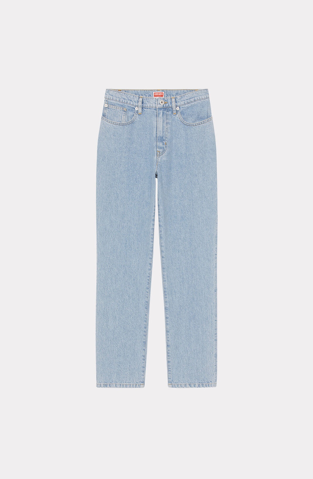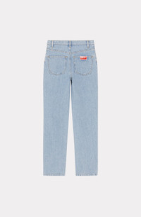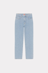 With these jeans, artistic director Nigo develops and refines the House's Japanese denim, a key element of the season. The light blue stonewash colour and straight cut give this piece a streamlined look, featuring a KENZO Paris jacron on a back pocket. Straight jeans in Japanese denim. KENZO Paris jacron on the back. Mid-rise waist with belt loops. 5 pockets. Contrast stitching. Zip and button closure. SIZE & FIT Straight cut. Medium-high waist. Leg length: 103 cm. COMPOSITION & CARE Made in Tunisia 100% cotton