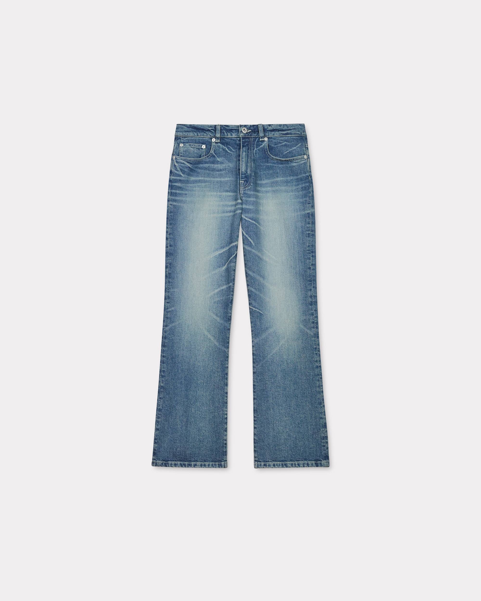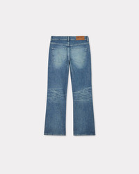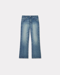 BARA cropped fit jeans dirty concept. Stretch fabric. Dirty stone bleach. Japanese denim. Contrasted topstitches. 'KENZO Paris' leather jacron at back. Engraved buttons and Mont Fuji topstitches at back pockets. Product Reference: FE62DP2296S7.DY SIZE & FIT The model is 175 cm tall and wears a size S. Regular waist. Leg length at 95 cm. COMPOSITION & CARE Made in Tunisia 98% cotton, 2% elastane Do not bleach Mild professional dry-cleaning in: hydrocarbons Iron at low temperature Line drying in the shade Do not tumble dry 30°C very mild fine wash Very mild professional wet-cleaning
