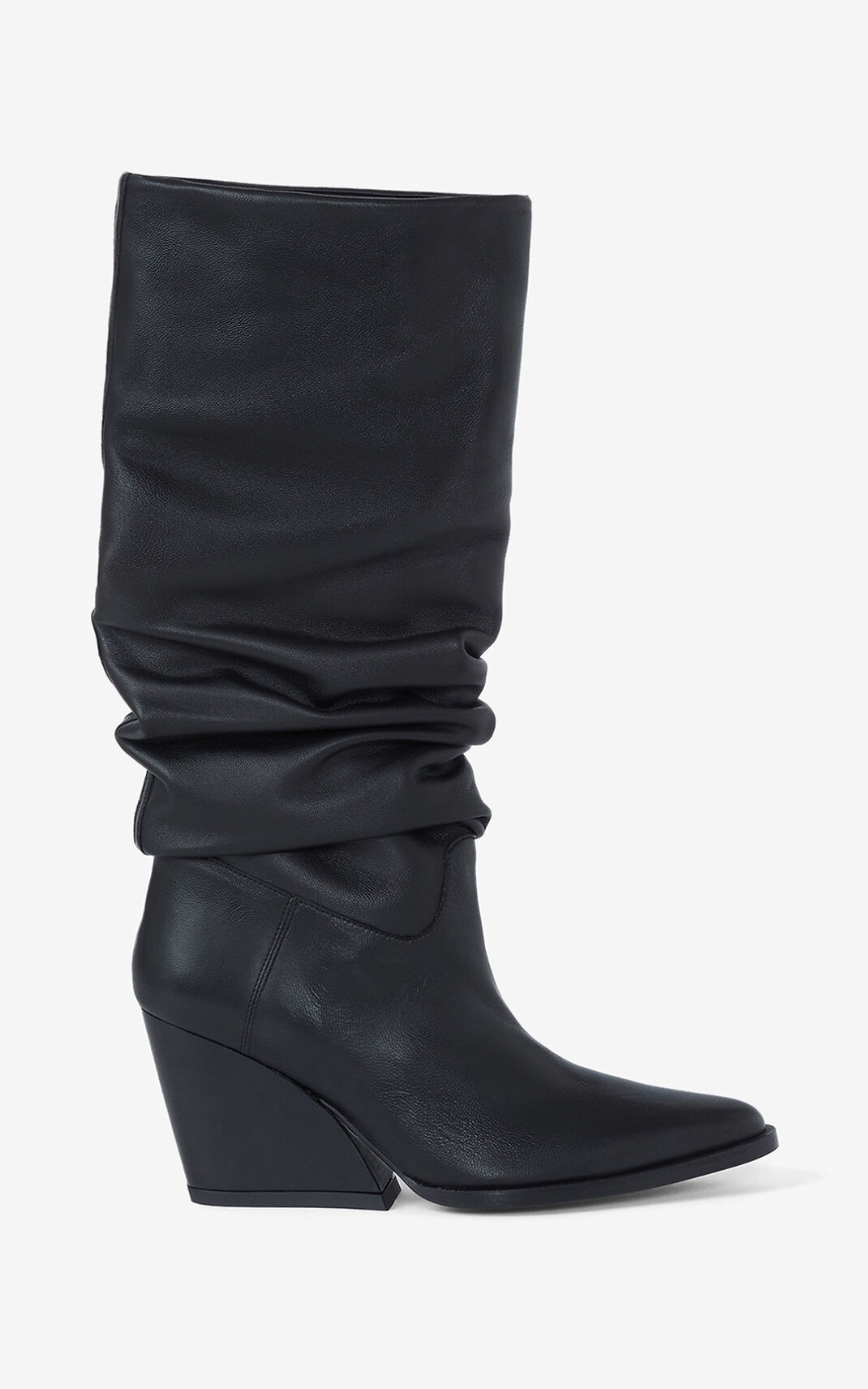These high-top boots are made from leather and will keep your feet warm all winter without compromising on your style. They have an attractive draped effect above the ankle thanks to their supple material. The originally shaped heel creates an ultra-feminine but still comfortable shoe. High-heeled sheepskin leather boots. Upper with leather pleats. Leather lining. Pointed toe. Leather sole with engraved KENZO signature. 8 cm heel. Size & fit Heel height: 8 cm. This model has a normal fit so choose your usual size. Composition & care Made in Spain 100% lamb leather