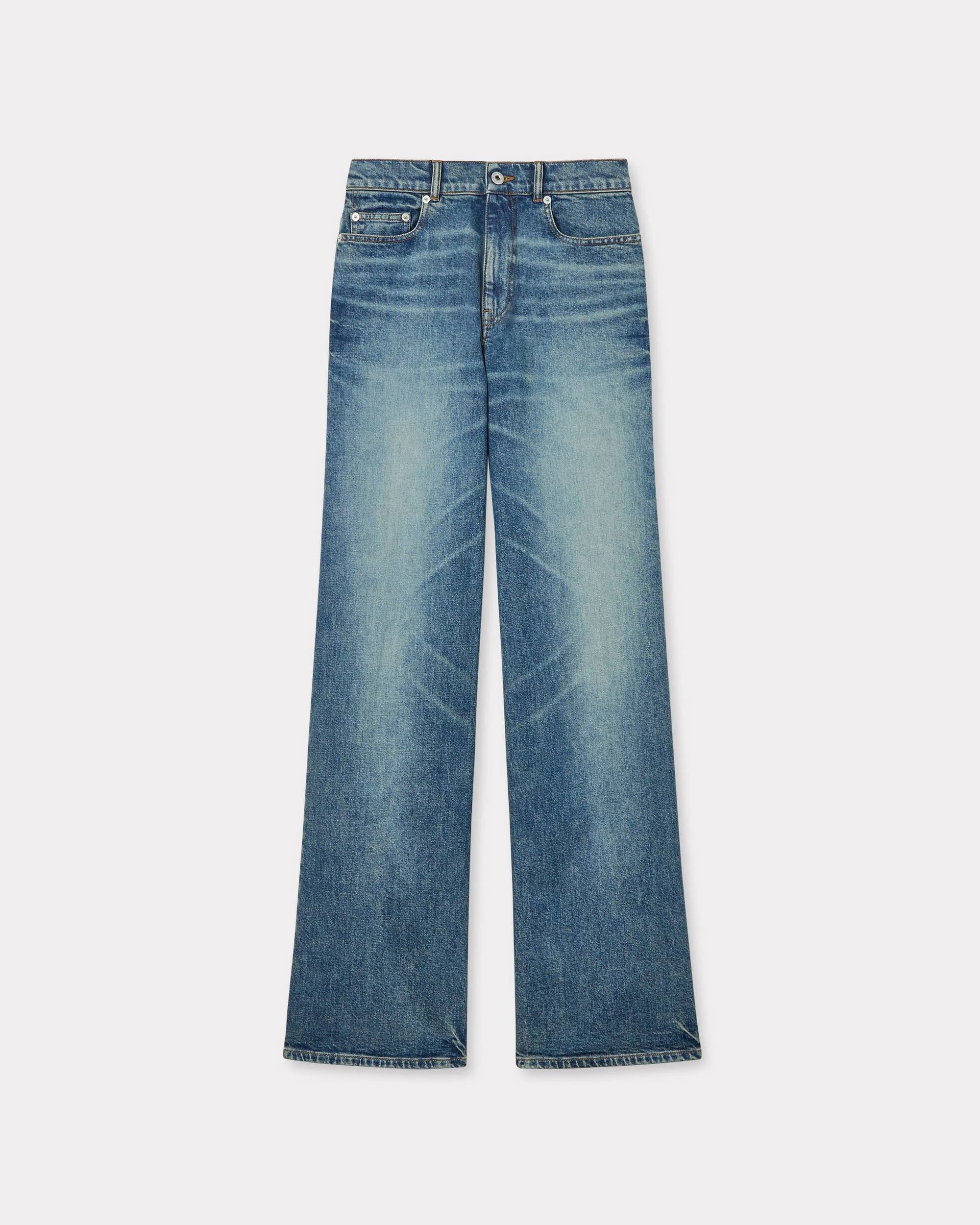AYAME wide jeans in japanese denim. Stretch japanese denim. Stone wash. Contrasted topstitches. 'KENZO Paris' leather jacron at back. Engraved buttons and Mont Fuji topstitches at back pockets. Product Reference: FF52DP2176S7.DS SIZE & FIT The model is 175 cm tall and is wearing size S. Leg length at 113 cm. COMPOSITION & CARE Made in Portugal 98% cotton, 2% elastane Do not bleach Mild professional dry-cleaning in: hydrocarbons Iron at low temperature Line drying in the shade Do not tumble dry 30°C very mild fine wash Very mild professional wet-cleaning