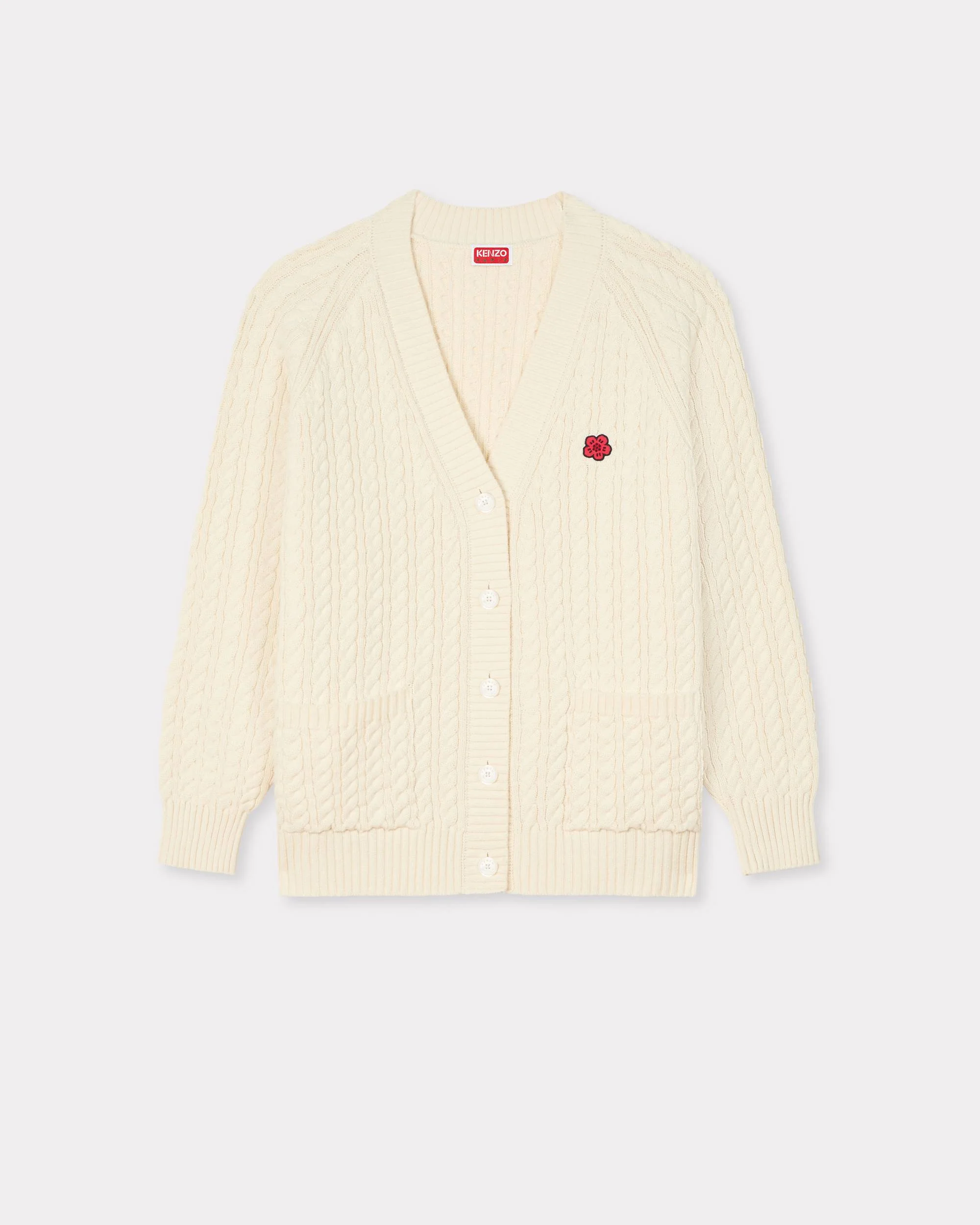 'Boke Flower' loose knit cardigan. Cotton Wool cable knit. V-neck. Two front pockets. ‘Boke Flower’ badge embroidered on the chest. Product Reference: FG52CA7283LK.03 SIZE & FIT The model is 175 cm tall and is wearing size S. Loose fit. Mid length, covering the bottom. COMPOSITION & CARE Made in Bulgaria 85% cotton, 15% wool Do not bleach Mild professional dry-cleaning in: hydrocarbons Iron at low temperature Flat drying in the shade Do not tumble dry 30°C very mild fine wash Very mild professional wet-cleaning