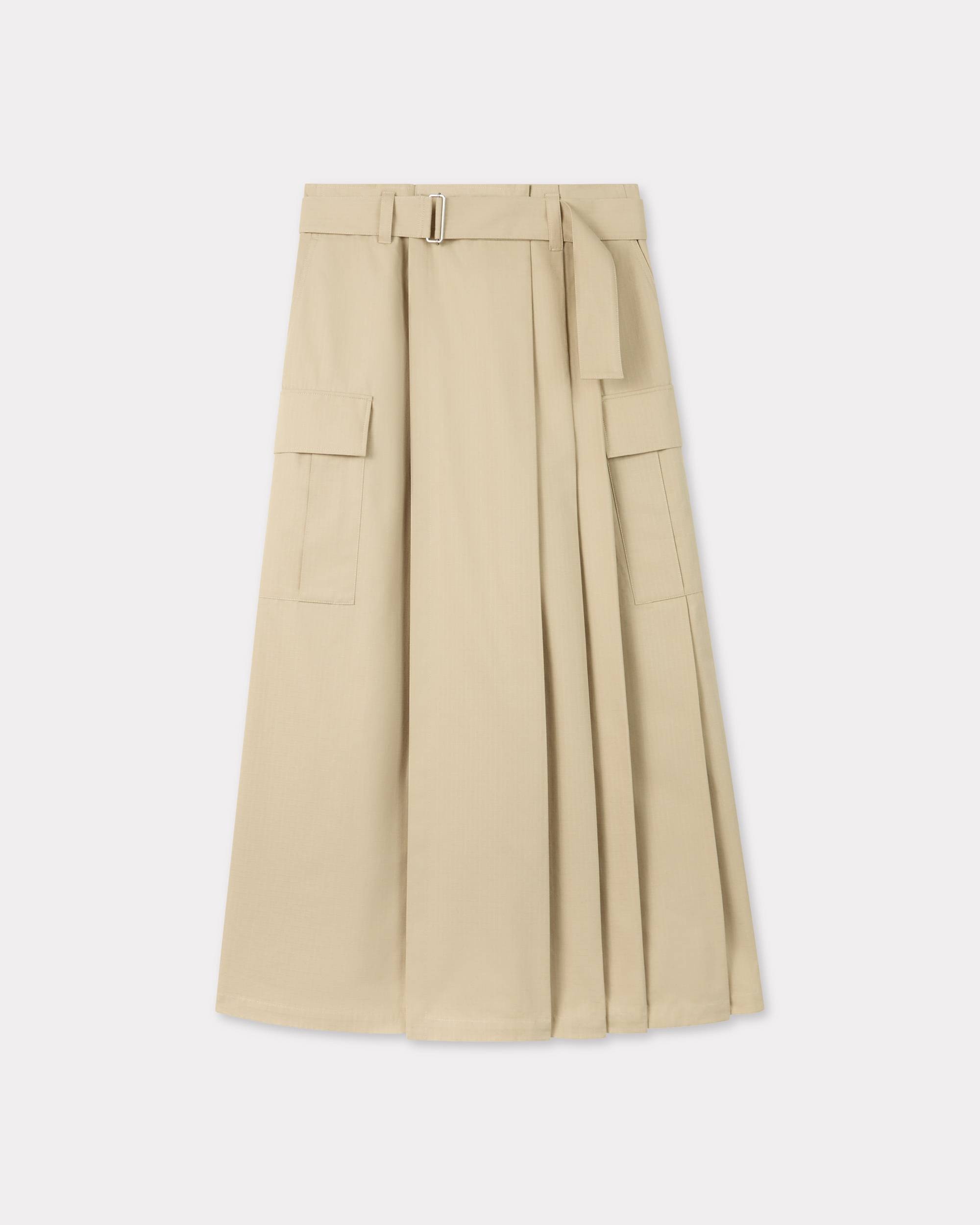Cargo long skirt in cotton ripstop. 2 seam pockets & 2 patch pocket at side with flap and large pleats at front. Elasticated band at back and belt to adjust the waist. Bicolor 'KENZO Paris' label at side pocket. Product Reference: FF52JU3039DL.11 SIZE & FIT The model is 175 cm tall and is wearing size S. Back length at 95 cm. COMPOSITION & CARE Made in Bulgaria 100% cotton Do not bleach Mild professional dry-cleaning in: hydrocarbons Iron at low temperature Line drying in the shade Do not tumble dry Do not wash Do not wet-clean