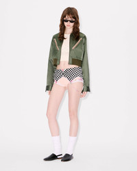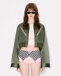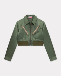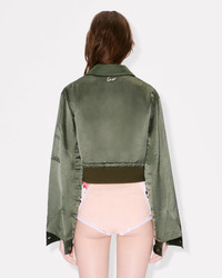 Cropped bomber. Satin linen. Non lined shape. Full zip opening. 4 pockets at front and 1 pocket at sleeve. Mlitary codes as the front zipped pockets, the buttons and the ribs at bottom. KENZO Archive pink embroidery at back under the collar. Product Reference: FF62BL2429FX.51 SIZE & FIT The model is 175 cm tall and is wearing size S. Cropped length. Back length at 46 cm. COMPOSITION & CARE Made in Bulgaria 60% linen, 40% viscose Do not bleach Mild professional dry-cleaning in: hydrocarbons Iron at low temperature Line drying in the shade Do not tumble dry Do not wash Do not wet-clean