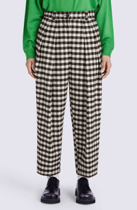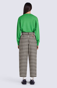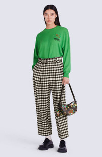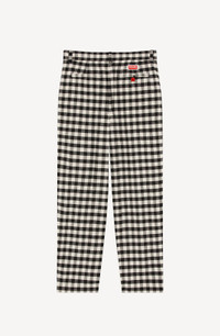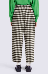 These pleated trousers offer an elegant look and elongate your figure thanks to their cropped cut and high waist. Composed of a refined fabric, they stand out for their timeless gingham checked pattern. The flower-shaped button at the back contrasts with the fabric and represents the iconic emblem of the collection. Wool and linen blend trousers. Pleats down each leg. High waist. All-over gingham check. 2 side slant pockets. 2 back piped pockets, one with flower-shaped button. Belt loops. KENZO Paris label on back. Zip and button fly at front. SIZE & FIT High waist. Leg length: 93 cm. COMPOSITION & CARE Made in Madagascar 45% linen, 41% virgin wool, 14% polyamide