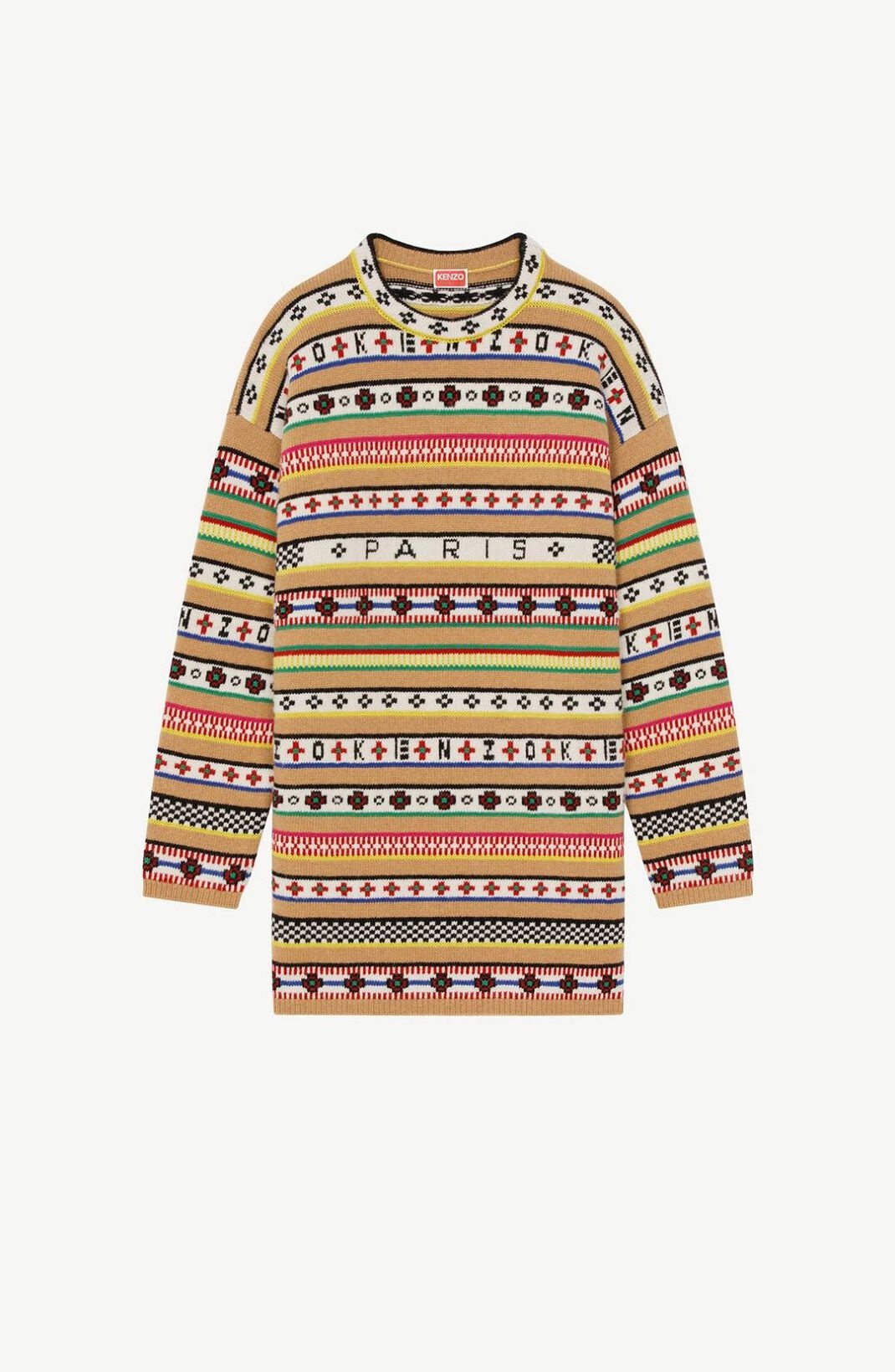 Nigo dives back into the archives with this 'Fair Isle' jacquard motif inspired by the 1980s. The merino wool threads are worked into a complex graphic motif. Stylised poppies and the 'KENZO Paris' name are hidden within the boldly coloured stripes. Merino wool jumper dress. Long sleeves. Mix of plain stripes and graphic jacquard stripes. KENZO signature inside the motif. SIZE & FIT Straight cut. COMPOSITION & CARE Made in Italy 69% wool, 31% cotton