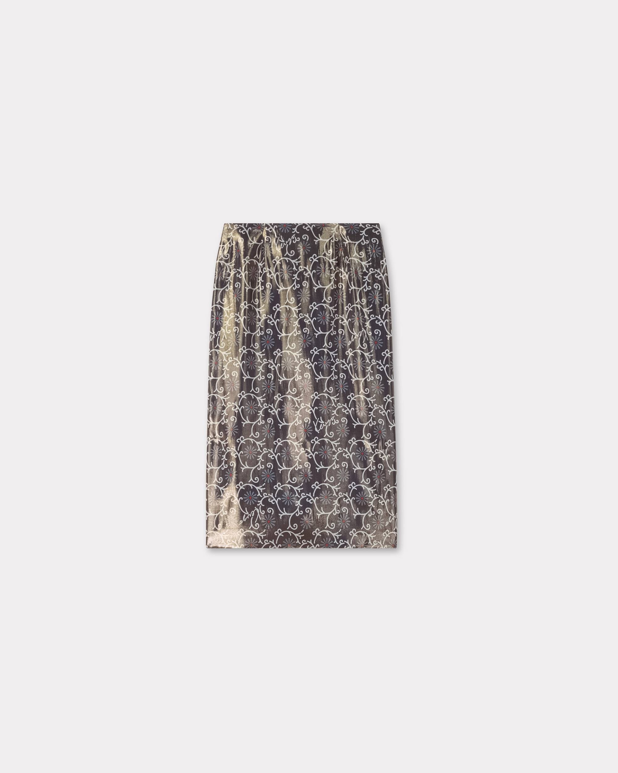 'KENZO Marguerite' straight midi skirt. 'KENZO Marguerite' all over print. Invisible zip at side. 'KENZO Paris' archive signature inside the pattern. Product Reference: FE62JU2959P1.79 SIZE & FIT The model is 175 cm tall and wears a size S. Back length : 65 cm. COMPOSITION & CARE Made in Tunisia 80% viscose, 20% metallic fibers Do not bleach Mild professional dry-cleaning in: hydrocarbons Iron at low temperature Line drying in the shade Do not tumble dry Do not wash Do not wet-clean
