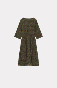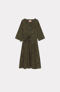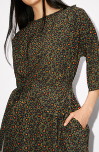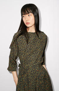 On this dress, Nigo offers a variation of the iconic Japanese flower. The boke flower takes on an animal form to produce the 'Hana Leopard' pattern decorating this flowing dress, which fastens at the shoulder with a button. The print appears simple, but it delivers a surprise. Midi dress with mid-length sleeves. Neckline fastens with flower-shaped buttons on shoulder. All-over 'Hana Leopard' print. Belt with coin pocket. SIZE & FIT Midi length. COMPOSITION & CARE Made in Tunisia 100% viscose