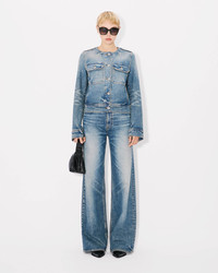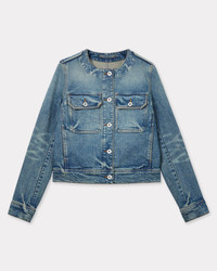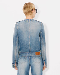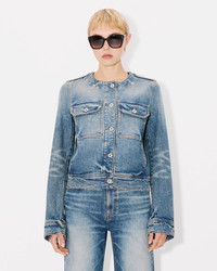 Collarless jacket. Stone wash. Stretch japanese denim. Shoulder tabs and contrasted topstitches. 4 patch pockets at front and two jetted pockets at side. Engraved buttons and KENZO leather brown jacron at back. Product Reference: FF52DV2506S7.DS SIZE & FIT The model is 175 cm tall and is wearing size S. COMPOSITION & CARE Made in Portugal 98% cotton, 2% elastane Do not bleach Mild professional dry-cleaning in: hydrocarbons Iron at low temperature Line drying in the shade Do not tumble dry 30°C very mild fine wash Very mild professional wet-cleaning