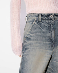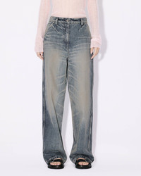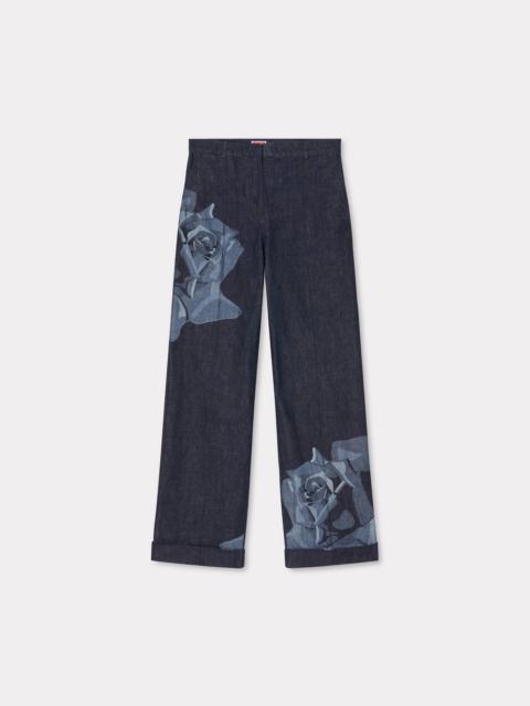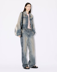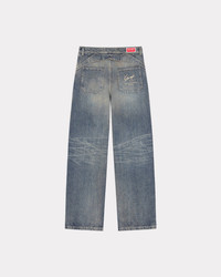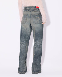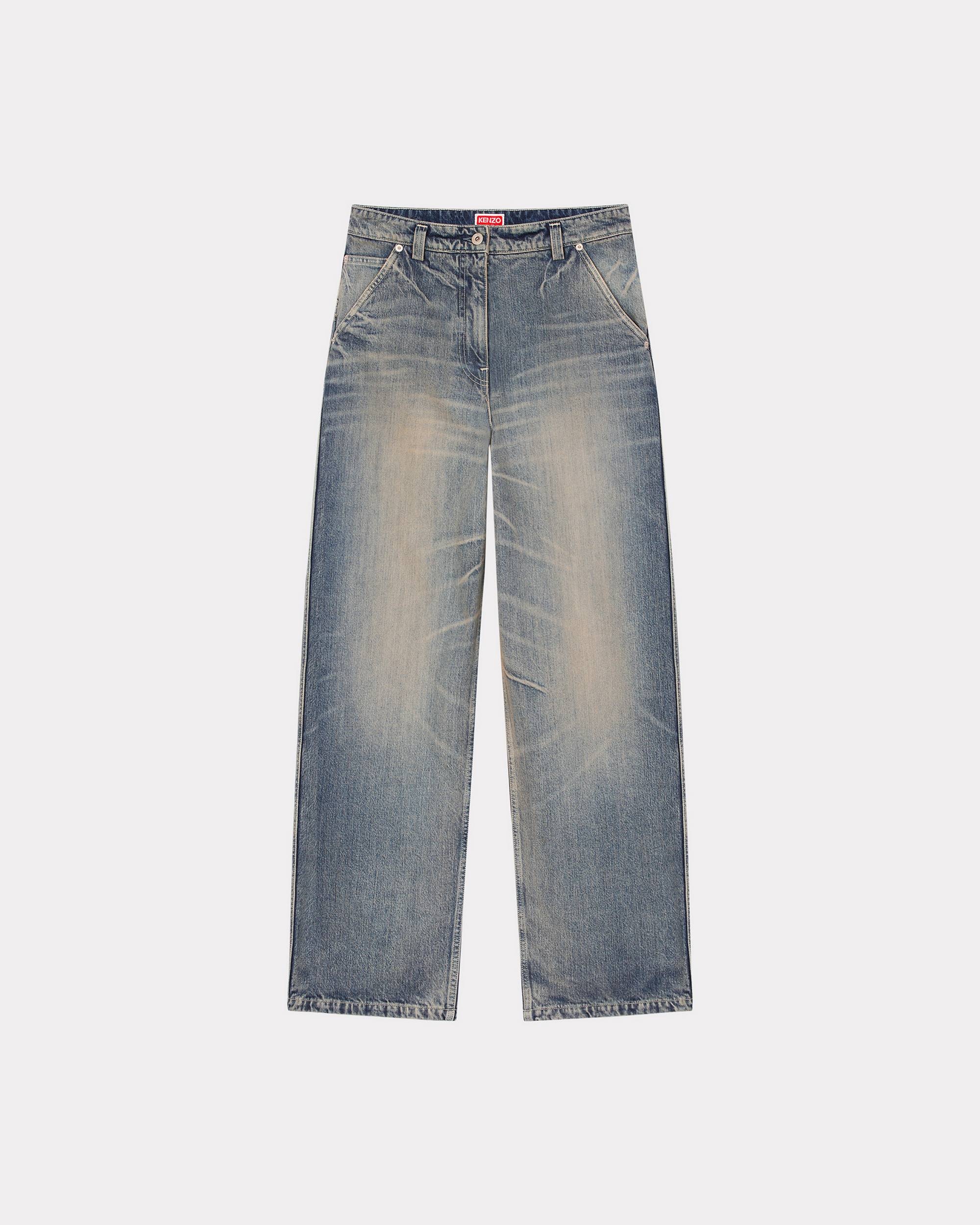 These Japanese denim trousers have been given a seasonal blue stone wash inspired by the vintage 'KENZO Jeans' designs of the 80s. The back pocket is embellished with the 'KENZO Paris' signature and a poetic message reading 'Création pour un monde plus beau' (Creation for a more beautiful world). The new baggy, low-waisted design offers a variety of looks. Japanese Kaihara denim baggy trousers. 'KENZO Paris' jacron on the back. 'KENZO Paris' signature and 'Création pour un monde plus beau' on the back pocket. Low waist. Quality construction with contrasting topstitching. Button fastening. SIZE & FIT Baggy cut.Length of leg: 111 cm.The model is 175 cm tall and wears a size S. COMPOSITION & CARE Made in Tunisia 100% cotton