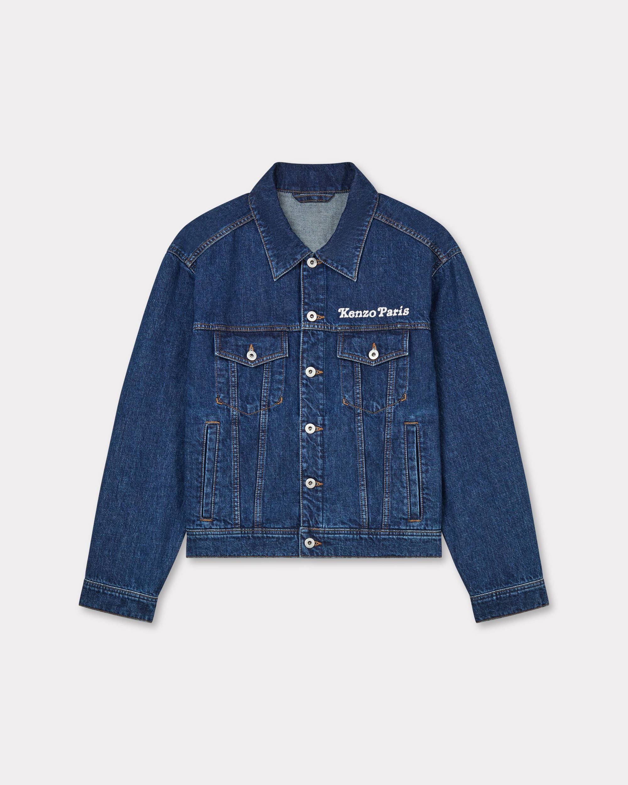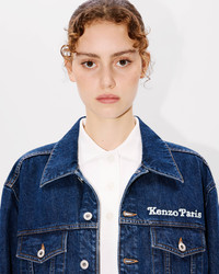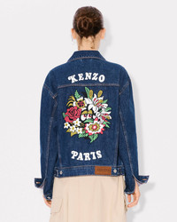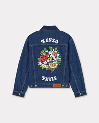 This denim jacket features a rich graphic on the back designed by Verdy - a bouquet of flowers embroidered in vibrant colours. Made from high-quality Japanese Kaihara denim, this model features unique details such as contrasting top stitching and a 'KENZO Paris' signature leather jacron on the lower back. 'KENZO by Verdy' embroidered trucker jacket in japanese denim. Stone wash and multicolor embroidery at back. Contrasted topstitches. Two patch pockets at front and jetted pockets at side. Engraved buttons. Front & back 'KENZO Paris' embroidery. 'KENZO Paris' leather brown jacron at back. Product Reference: FF52DV2486B3.DS SIZE & FIT The model is 175 cm tall and is wearing size S. Oversize fit. COMPOSITION & CARE Made in Tunisia 100% cotton Do not bleach Mild professional dry-cleaning in: hydrocarbons Iron at low temperature Line drying in the shade Do not tumble dry Hand wash Very mild professional wet-cleaning