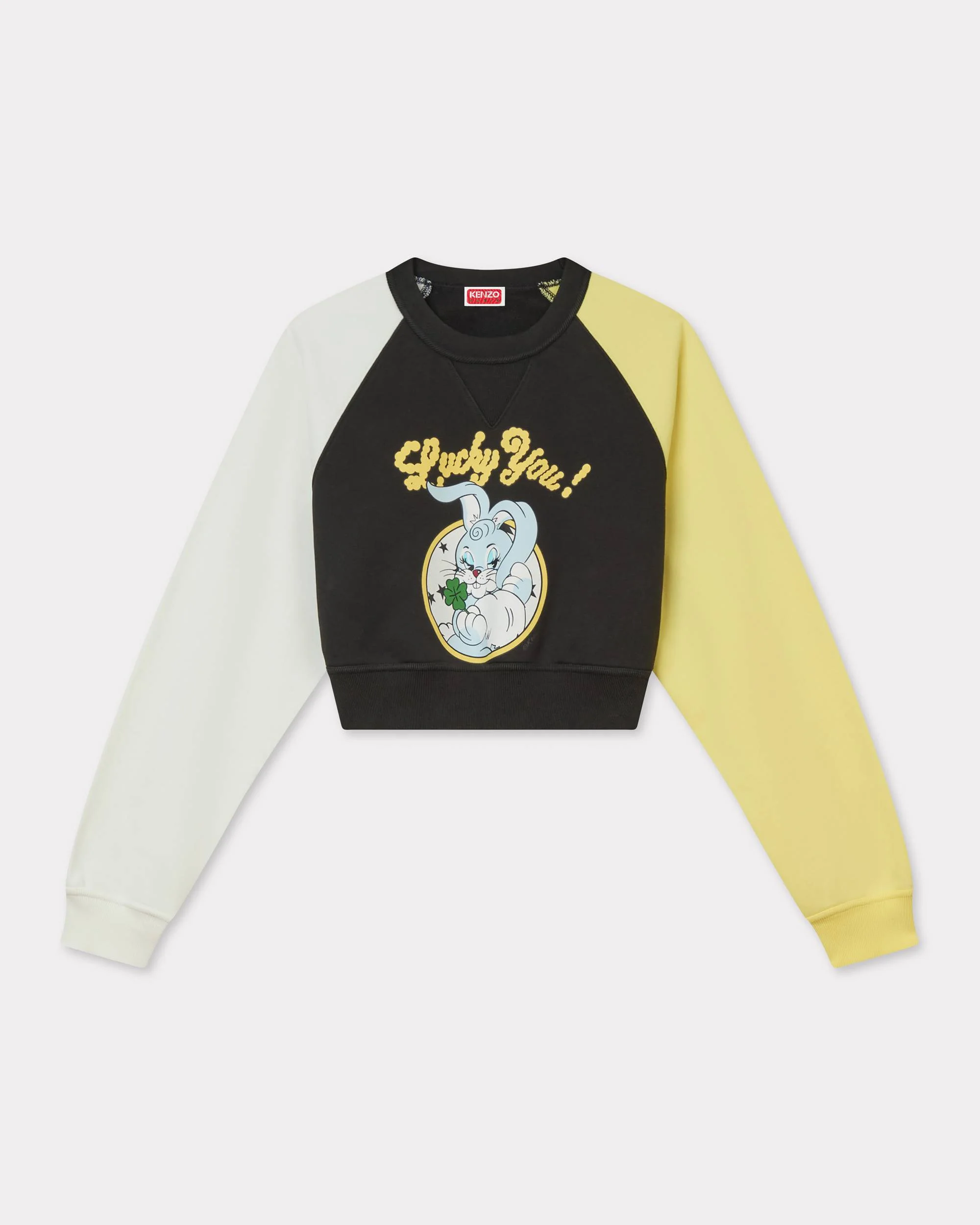 From the creative world of the Autumn-Winter 2025 fashion show, this cropped sweatshirt features K@li the rabbit on the front and Luke the rabbit on the back, two iconic characters from the collection. Made from lightly brushed fleece, the graphics emphasise the loving relationship between the characters. 'KENZO Cartoon' cropped sweatshirt. Crewneck. Light Brushed Molleton. Front and back placed printed graphic. Seasonal branding printed in the artwork. Product Reference: FF62SW0514MR.99J SIZE & FIT The model is 175 cm tall and is wearing size S. Cropped length. COMPOSITION & CARE Made in Portugal 87% cotton, 13% polyester Do not bleach Do not dry-clean Iron at low temperature Flat drying in the shade Do not tumble dry 30°C very mild fine wash Very mild professional wet-cleaning