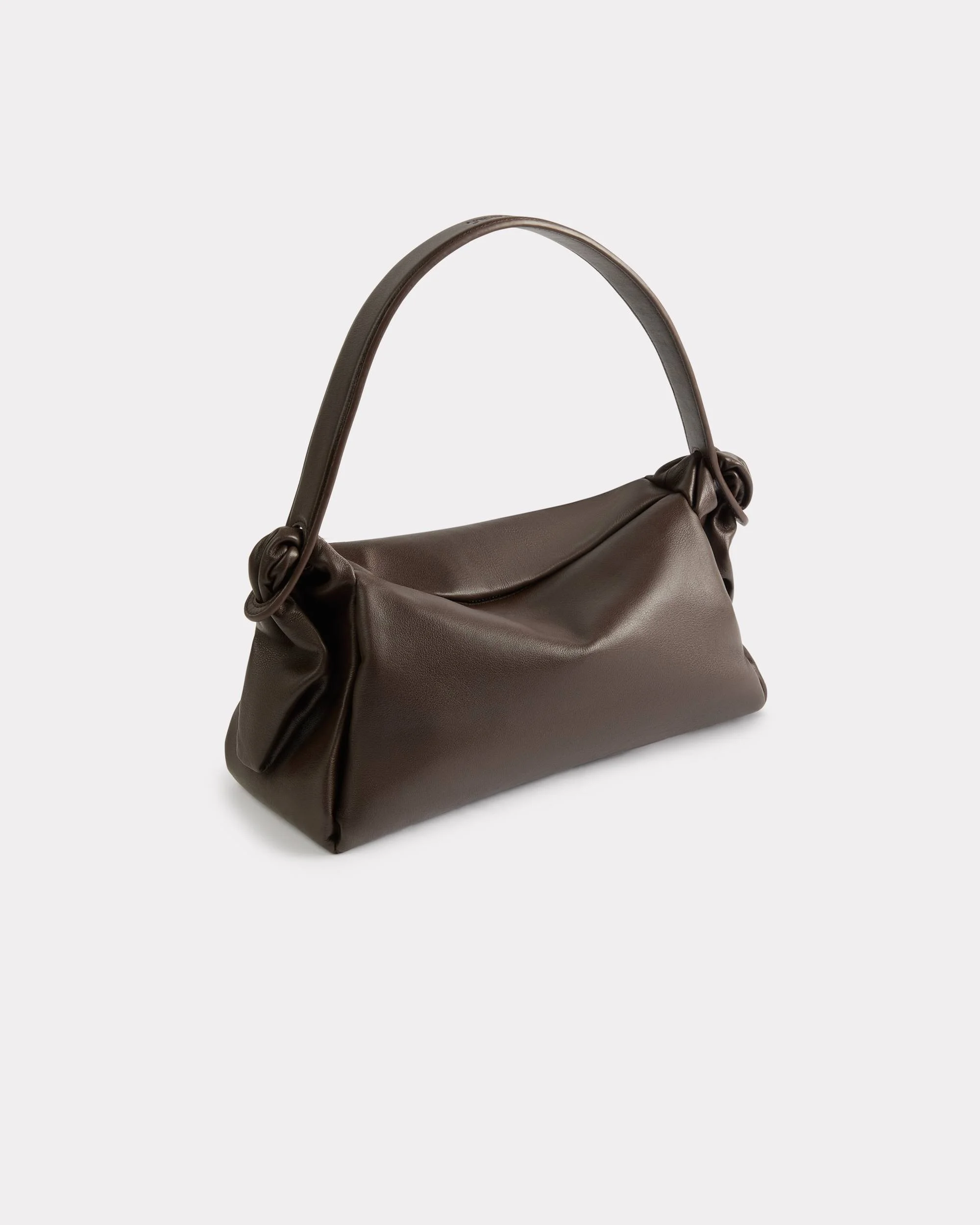 An homage to the eponymous Japanese wrapping technique, this large and capacious Furoshiki bag is a new interpretation of the model first seen on the Autumn-Winter 2024 catwalk. Made from supple Italian leather that evokes the fluid texture of traditional fabrics, it reproduces the knots and folds of this age-old tradition. 'KENZO Furoshiki' large bag in leather. Shoulder-carried. Large handle. Zip fastener. 1 inside zipped pocket. 1 inside card case. Embossed 'KENZO Paris' logo on the top handle. Product Reference: FF62SA828L01.91.TU SIZE & FIT Dimensions: 35 x 42.5 x 16 cm. Handle drop length: 23 cm. COMPOSITION & CARE Made in Spain 100% cow leather Do not dry-clean Do not tumble dry