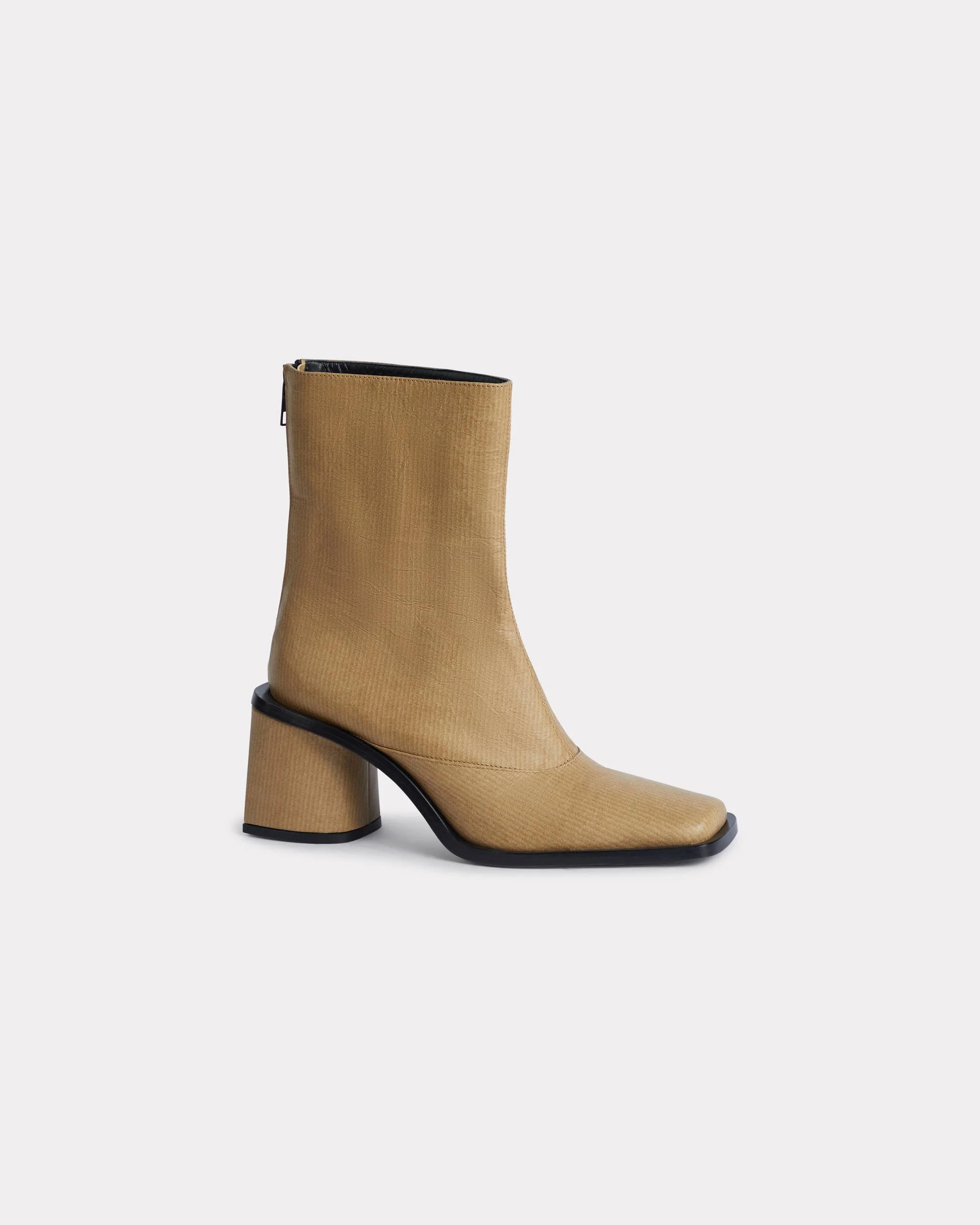 'KENZO Kimi' ankle boots. Kraft paper-effect goat leather. Calfskin lining. Tonal sole in leather with abs heel. Contrasted black welt. KENZO silver letters on the back of the heel. Product Reference: FF62BT120L06.87 SIZE & FIT Sole: 7.5 cm. COMPOSITION & CARE Made in Italy 100% goat leather
