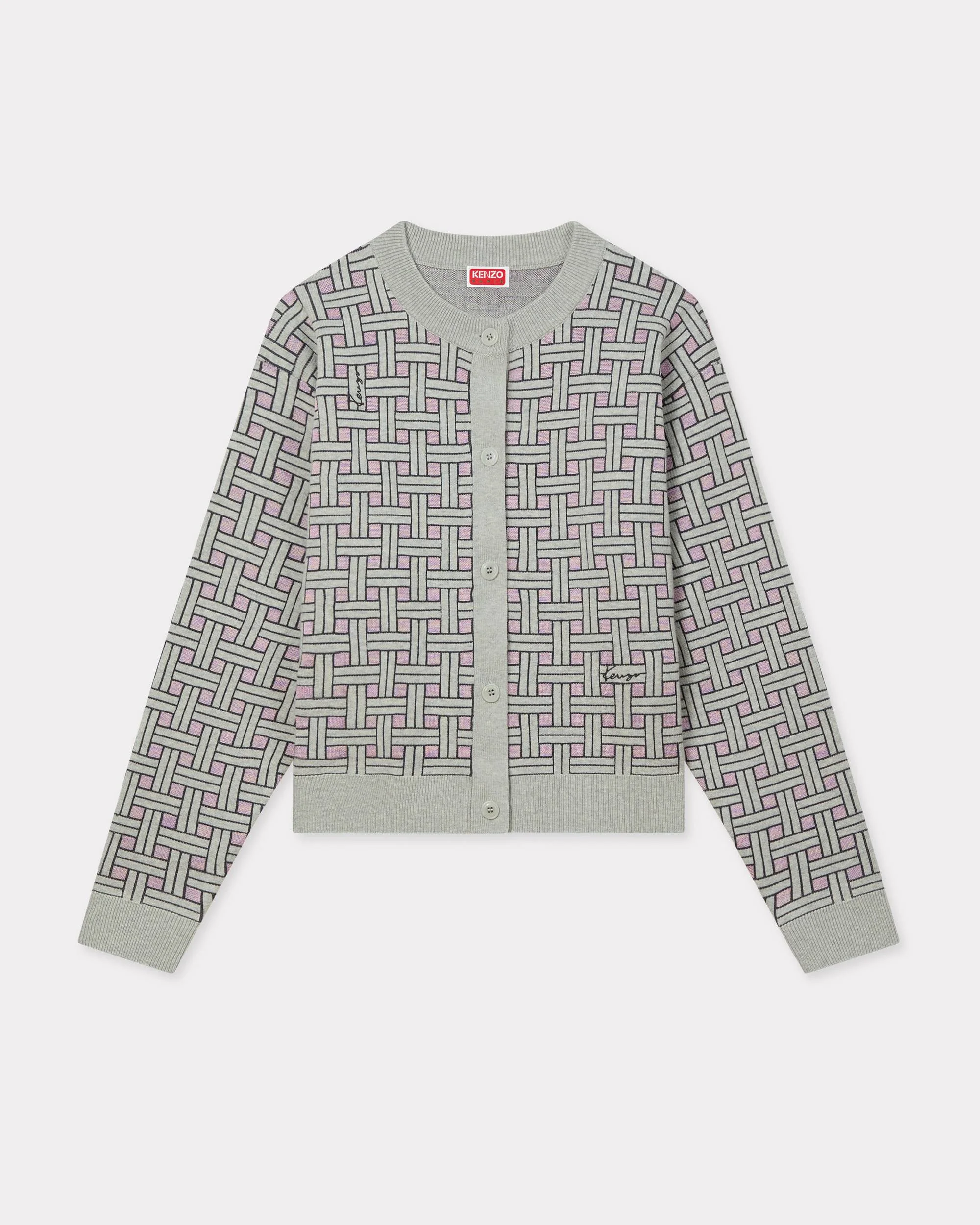 'KENZO Weave' cardigan. Wool and Cotton blend. Mid-lightweight jacquard highlighted by a space dye pop color. KENZO archive signature embroidered in the pattern. Tone on tone branded buttons. Product Reference: FF62CA7033CQ.93 SIZE & FIT The model is 175 cm tall and is wearing size S. COMPOSITION & CARE Made in China 36% wool, 29% cotton, 15% rayon, 14% viscose, 5% polyester Mild professional dry-cleaning in: hydrocarbons Iron at low temperature Flat drying in the shade Do not tumble dry 30°C very mild fine wash Very mild professional wet-cleaning