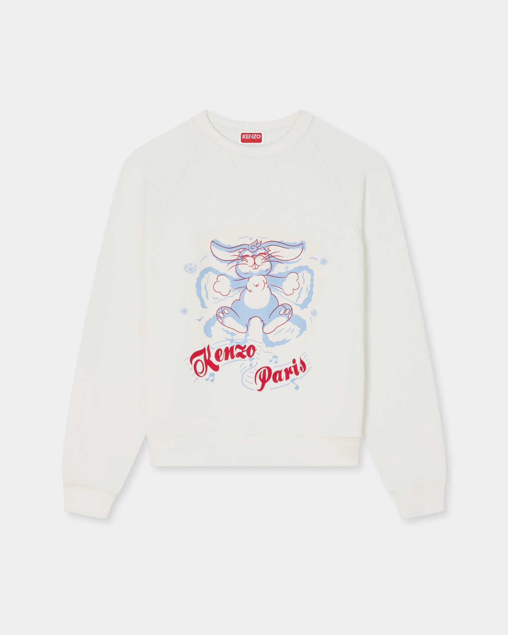 Made from a lightweight fleece, this round-neck sweatshirt is embellished on the front with a large print of the K@li rabbit playing in the snow. This piece also has a 'KENZO Paris' logo featuring musical notes that nostalgically evoke American greeting cards from the 1950s. 'KENZO Winter Holidays' sweatshirt in cotton. Light Soft Unbrushed Molleton with transeasonal weight. Front placed print. Seasonal branding printed at front. Product Reference: FG52SW2034MJ.02 SIZE & FIT The model is 175 cm tall and is wearing size S. Classic fit. COMPOSITION & CARE Made in Portugal 100% cotton Do not bleach Do not dry-clean Iron at low temperature Flat drying in the shade Do not tumble dry 30°C very mild fine wash Very mild professional wet-cleaning