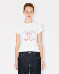 This classic cut jersey T-shirt is enhanced by a large print on the front featuring K@li the rabbit playing in the snow. This piece also has a 'KENZO Paris' logo featuring musical notes that nostalgically evoke American greeting cards from the 1950s. 'KENZO Winter Holidays' T-shirt. Single Jersey for a comfortable feel & transeasonal weight. Front placed print. Seasonal branding printed at front. Product Reference: FG52TS2024SK.02 SIZE & FIT The model is 175 cm tall and is wearing size S. Classic fit. COMPOSITION & CARE Made in Portugal 100% cotton Do not bleach Do not dry-clean Iron at low temperature Line drying in the shade Do not tumble dry 30°C mild fine wash Mild professional wet-cleaning