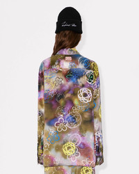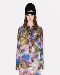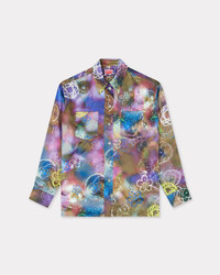 This oversized silk shirt is born from a unique collaboration between Kenzo and the artist Futura 2000. The colourful, graffiti-inspired print combines the fashion house's iconic Boke Flower with the artist's Atom motif, tying this piece into the collection's graphic aesthetic. 'Kenzo x Futura 2000' workwear shirt in silk. Shirt collar, single breasted closure and patch pockets at front. Allover print made by Futura 2000 offering the Boke Flower and his iconic atom in multiple colorways. 'Futura 2000 x Kenzo' branding at back collar, 'Kenzo Paris' engraved buttons. Product Reference: FF62CH2739S7.50 SIZE & FIT The model is 175 cm tall and is wearing size S. Back length at 72 cm. Oversize fit COMPOSITION & CARE Made in Tunisia 100% silk Do not tumble dry