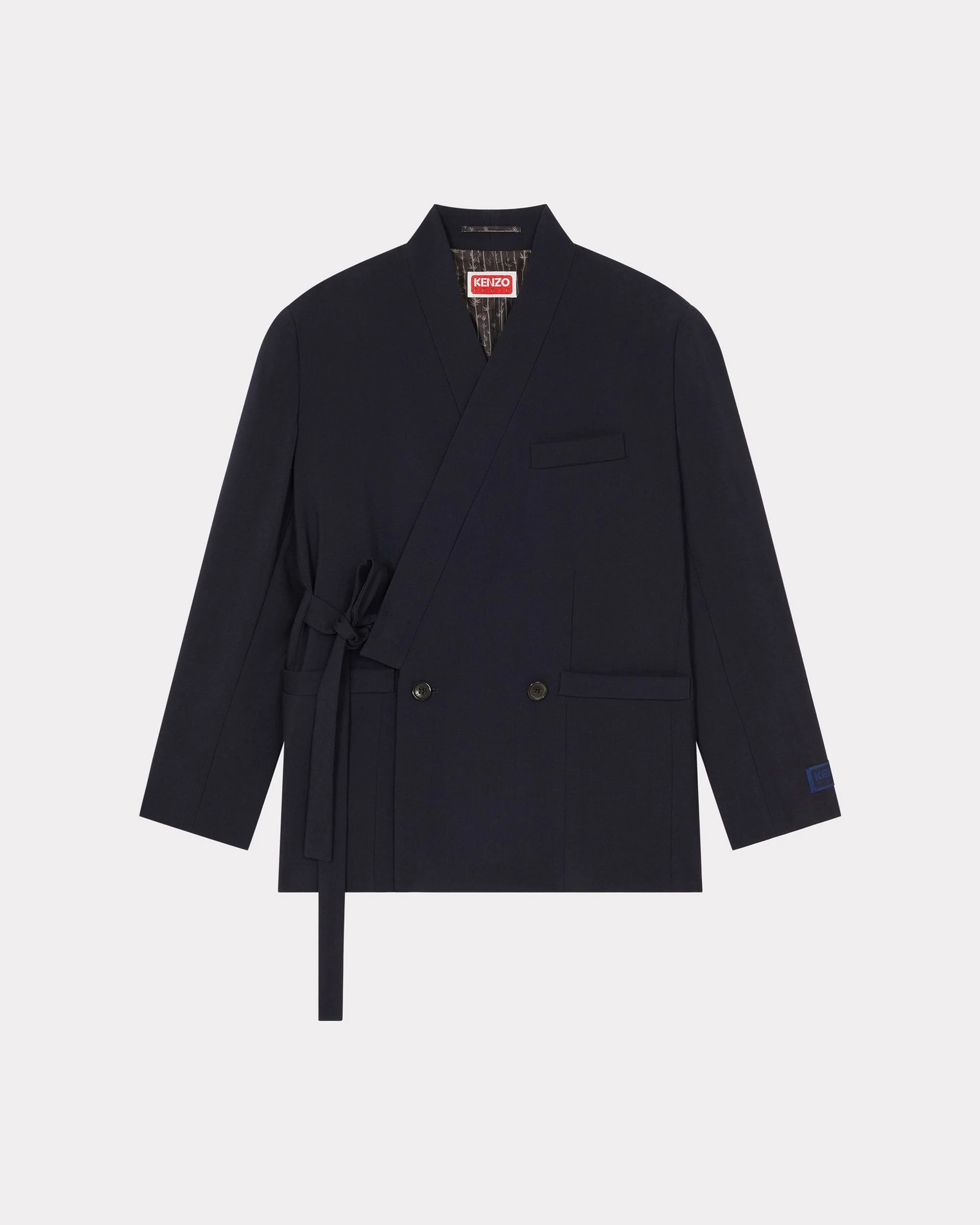 This kimono blazer from the VESTIAIRE DE NIGO FOR KENZO collection offers a blend of vintage inspiration and modern elegance. It comes with a hidden button at the collar for a perfect fit. Wear it as a suit jacket with the matching trousers or pair it with another piece from the collection. Long-sleeved kimono blazer. Kimono-style V-neck. Tone-on-tone 'KENZO Paris' label on the sleeve. Hidden button at the collar. Two welt pockets and one jet pocket on the chest. Two interior pockets, one of which fastens with a button. Three buttons and lateral slits at the cuff. Cross-over neckline with two buttons and a belted kimono fastening. Product Reference: FE52VE2529GE.77 SIZE & FIT Length at back: 72 cm. The model is 175 cm tall and wears a size S. COMPOSITION & CARE Made in Bulgaria 100% virgin wool Do not bleach Mild professional dry-cleaning in: hydrocarbons Iron at low temperature Line drying in the shade Do not tumble dry Do not wash Do not wet-clean