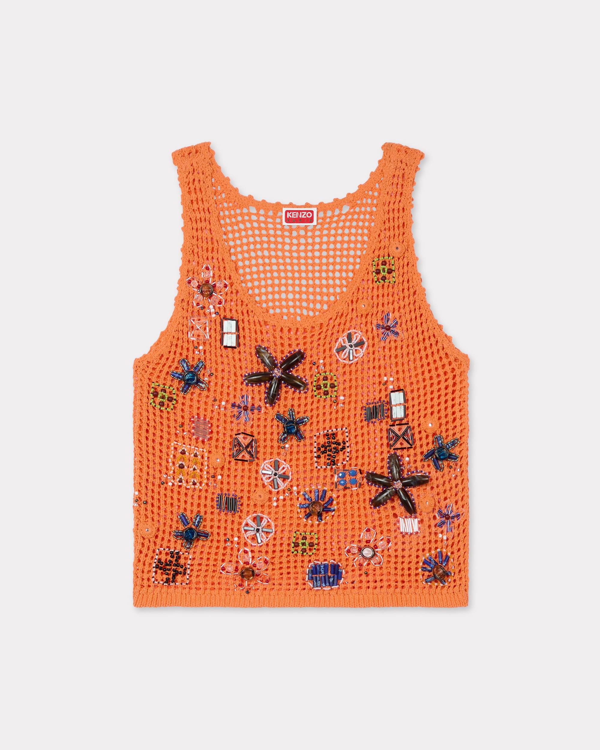 Seen on the Spring/Summer 2025 catwalk, this top is made from a mesh knit. Hand-embroidered pearls and jewels shaped as colourful flowers enrich this piece's design, creating a shimmering, embossed effect. Product Reference: FF52PU7073BF.17 SIZE & FIT The model is 175 cm tall and is wearing size S. COMPOSITION & CARE Made in China 64% cotton, 36% polyamide Do not bleach Do not dry-clean Do not iron Flat drying in the shade Do not tumble dry Hand wash Very mild professional wet-cleaning