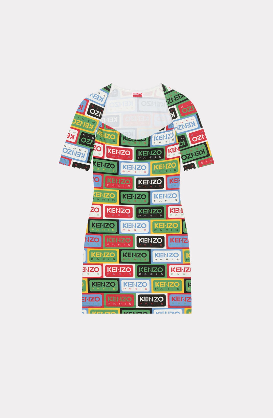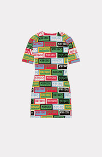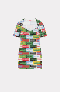This midi dress is enhanced by a brightly coloured pattern that takes its inspiration from a 1980s KENZO fashion show. Labels taken from the archives completely cover this garment creating a lively dynamic style. Bodycon midi dress. Short sleeves. Square neckline. All-over 'KENZO Labels' print. SIZE & FIT Fitted cut. COMPOSITION & CARE Made in Portugal 85% polyamide, 15% elastane