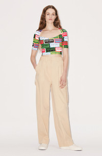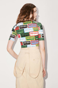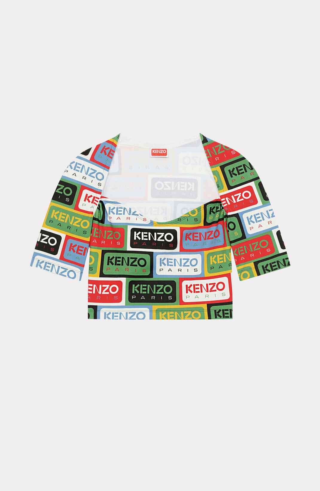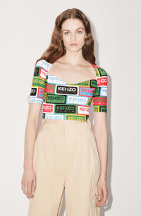 The print on this short colourful top reproduces labels from the KENZO archives. It is a central piece of the new collection and features a square neckline and close-fitted cut that enhances the figure. Short top with short sleeves. Square neckline. All-over 'KENZO Label' print. SIZE & FIT Short close-fitted cut. COMPOSITION & CARE Made in Portugal 85% polyamide, 15% elastane