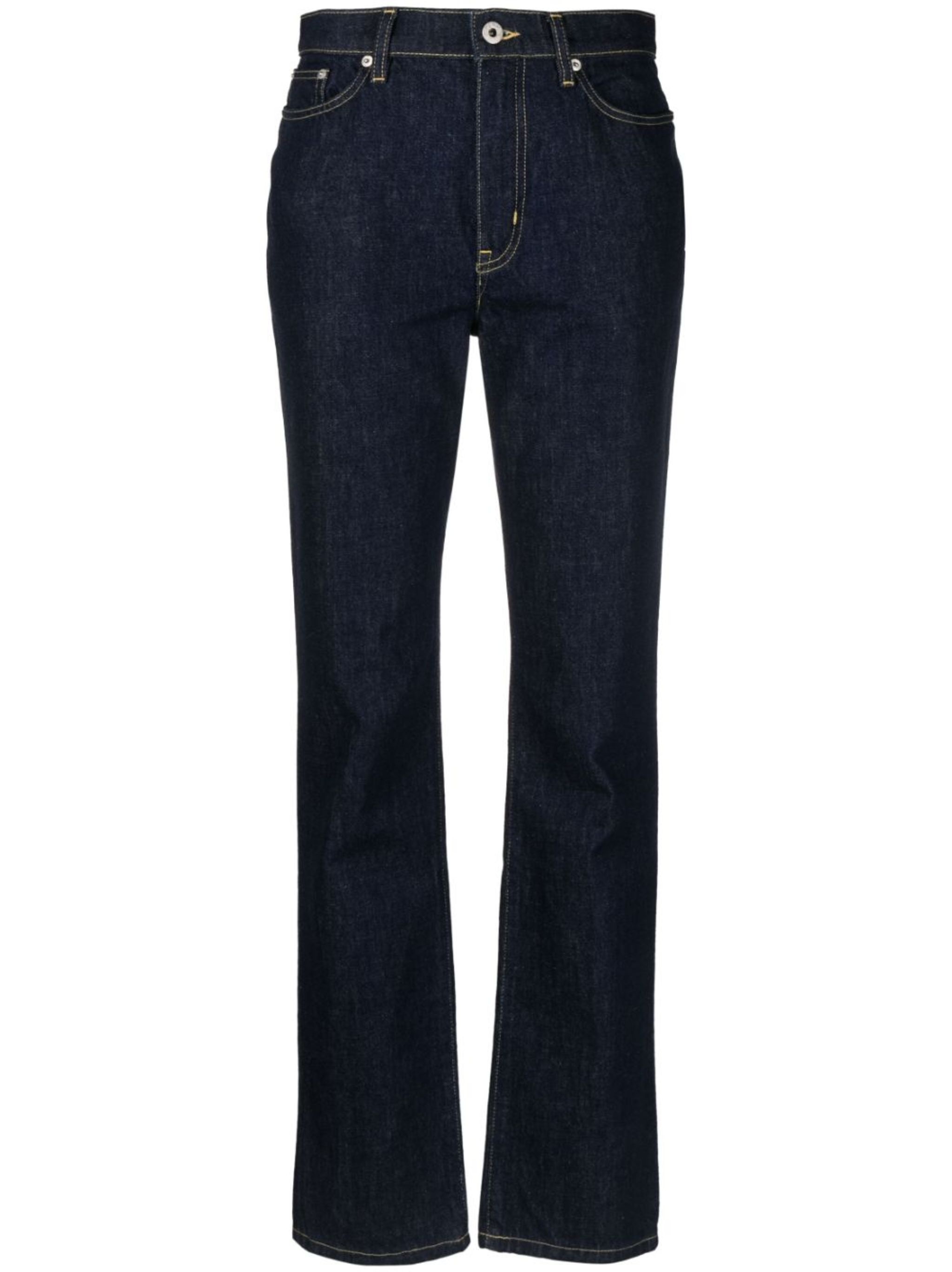 logo-patch high-waisted jeans from KENZO featuring indigo blue, cotton, denim, logo patch to the rear, high waist, straight leg, front button and zip fastening and classic five pockets. Size & Fit Model Measurements: Bust: 76cm Height: 177cm Hips: 83cm Waist: 57cm
