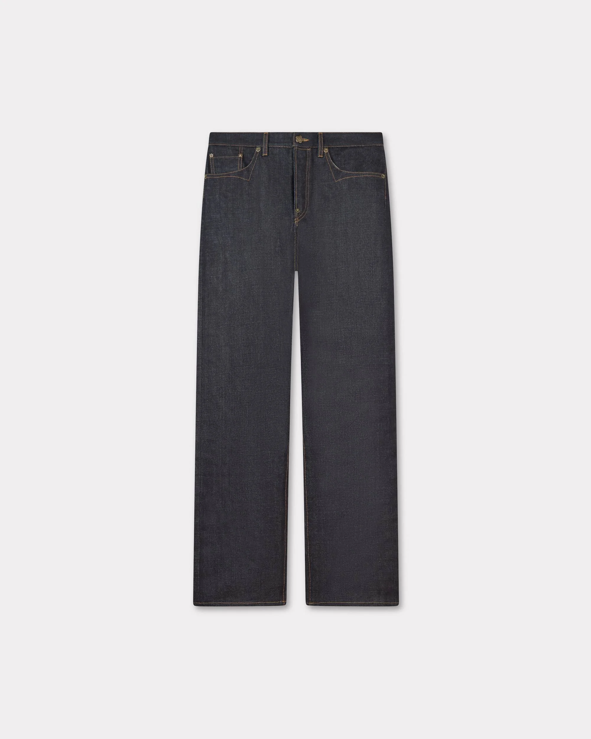 Low-waist jeans. Raw indigo japanese denim. Selvedge finishings in its traditional way : red and white. Flap at back to adjust the waist. 'KENZO Paris' leather jacron at back, engraved buttons, Boke 'KENZO Paris' front button and Mount Fuji topstitches at back pockets. Product Reference: FF62DP2366Q0.DR SIZE & FIT The model is 175 cm tall and is wearing size 26. Low-waist. COMPOSITION & CARE Made in Tunisia 100% cotton Do not bleach Mild professional dry-cleaning in: hydrocarbons Iron at low temperature Line drying in the shade Do not tumble dry 30°C very mild fine wash Very mild professional wet-cleaning