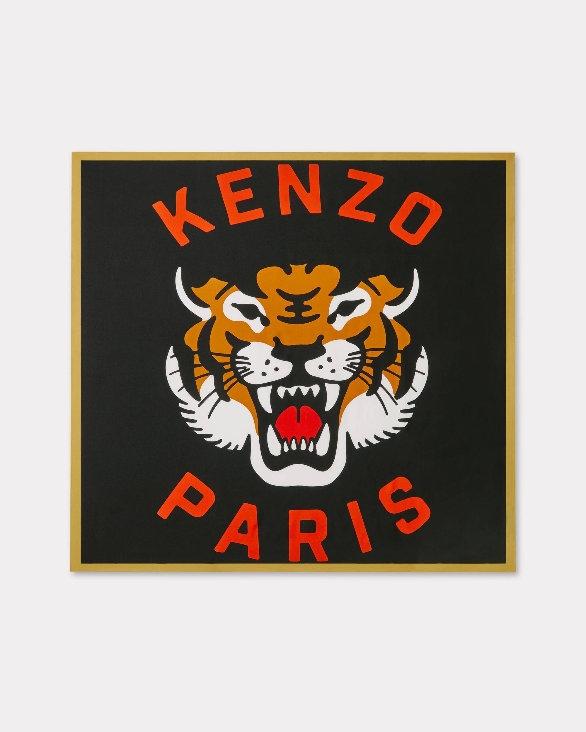 This silk square features the 'KENZO Lucky Tiger' print representing the iconic House mascot. The print integrates the KENZO Paris signature. This accessory can be worn around the shoulders or tied onto the handle of a purse. 'KENZO Lucky Tiger' silk square. 'KENZO Lucky Tiger' print. KENZO Paris signature integrated into the print. Contrasting edges. Product Reference: FE52EW320PEM.99.TU SIZE & FIT Dimensions: 90 x 90 cm. COMPOSITION & CARE Made in Italy 100% silk Do not bleach Mild professional dry-cleaning in: hydrocarbons Iron at low temperature Line drying in the shade Do not tumble dry Do not wash Do not wet-clean