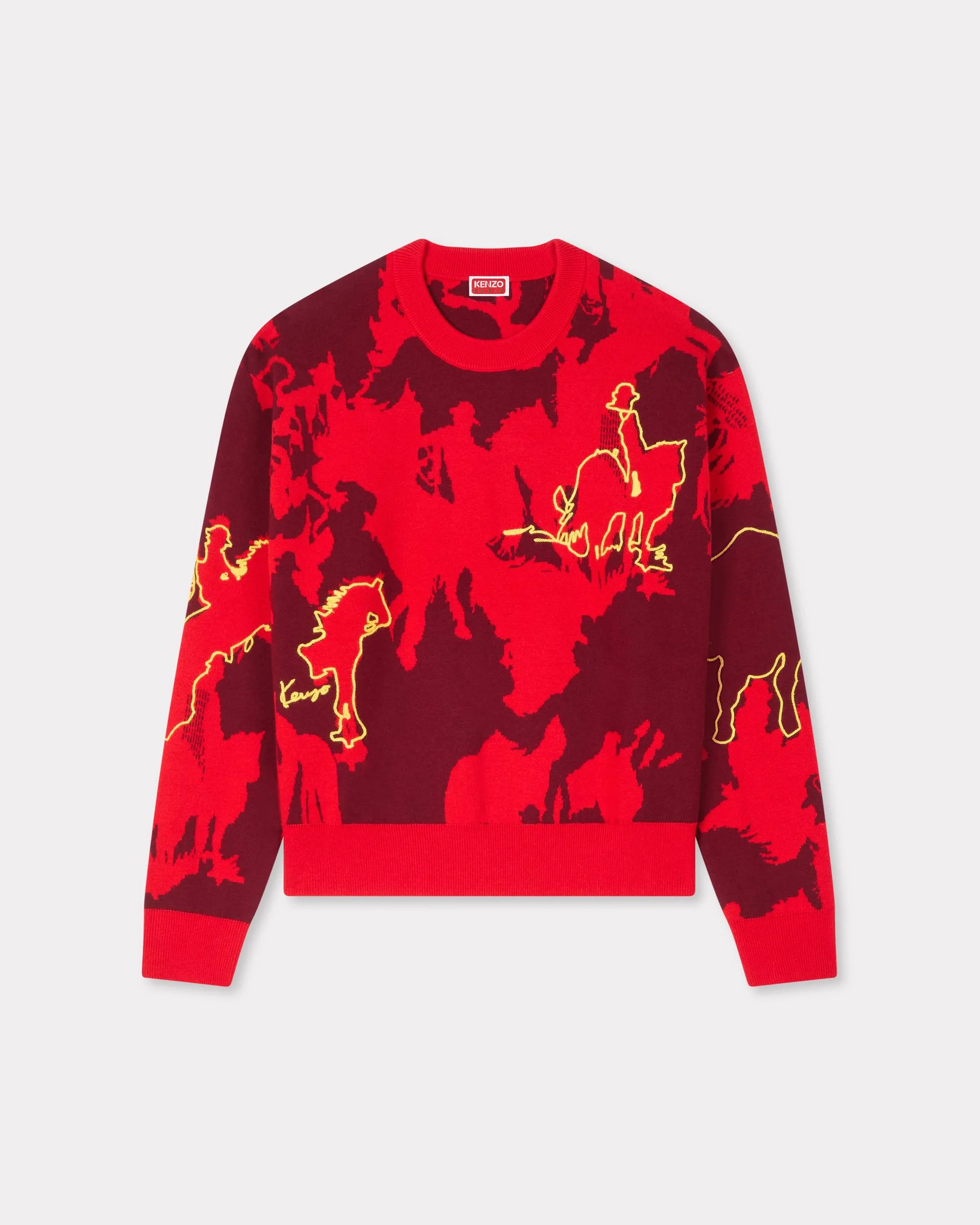 'Lunar New Year' jumper. Wool & Cotton Mix. Allover print from the archives. Kenzo Archive Signature embroidered in the artwork. Product Reference: FG52PU7403DM.22 SIZE & FIT The model is 175 cm tall and is wearing size S. Classic fit. This item fits true to size. Take your usual size. COMPOSITION & CARE Made in China 52% wool, 43% cotton, 5% elastane Do not bleach Mild professional dry-cleaning in: hydrocarbons Iron at low temperature Flat drying in the shade Do not tumble dry 30°C very mild fine wash Very mild professional wet-cleaning