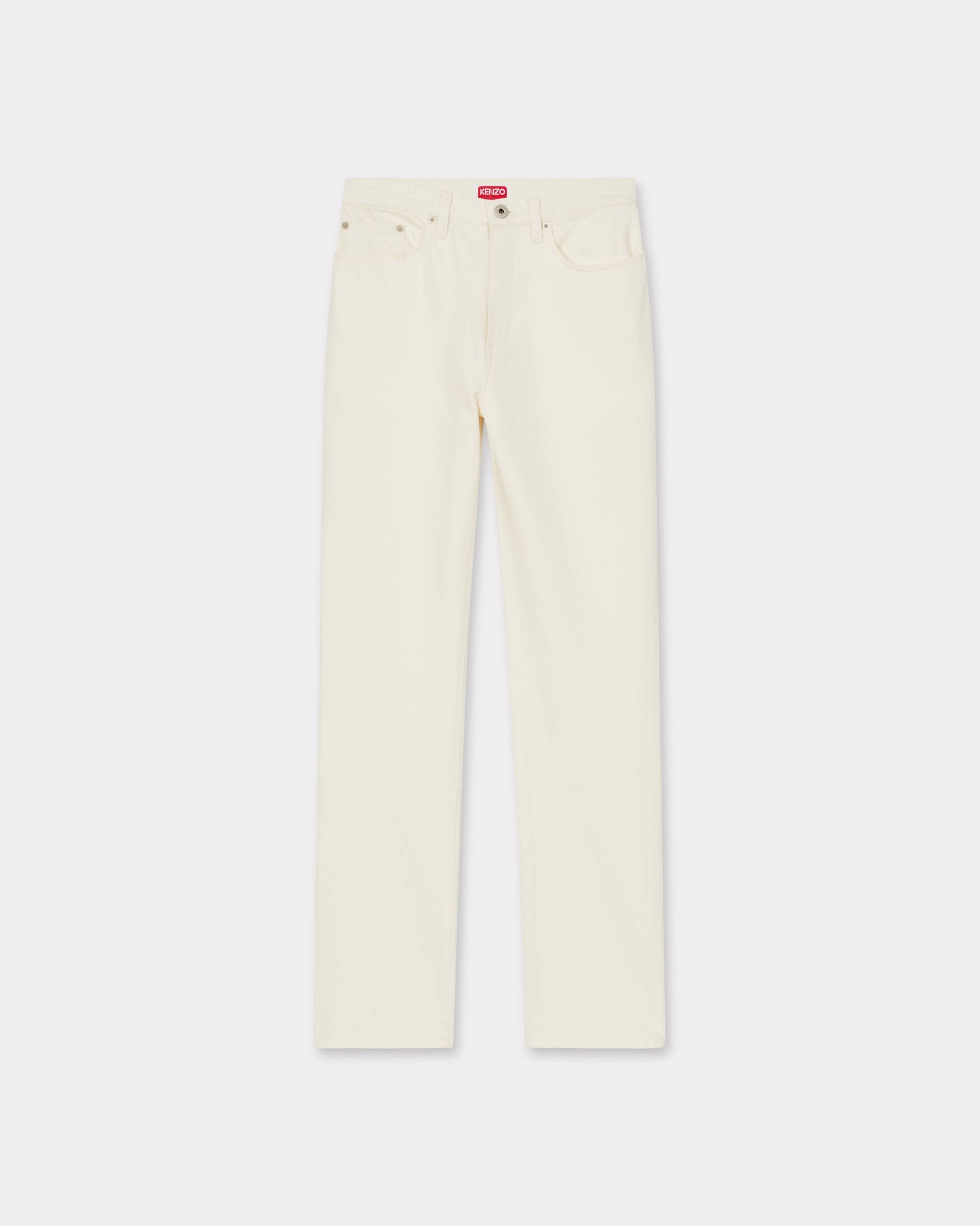 ASAGAO straight fit jeans. Rinse blue wash. Japanese denim. Contrasted topstitches. Kenzo jacron in paper at back. Product Reference: FE52DP2106W4.WT SIZE & FIT The model is 175 cm tall and wears a size S. Mid-raise waist. Leg length at 107 cm. COMPOSITION & CARE Made in Tunisia 100% cotton Do not bleach Mild professional dry-cleaning in: hydrocarbons Iron at low temperature Line drying in the shade Do not tumble dry 30°C very mild fine wash Very mild professional wet-cleaning