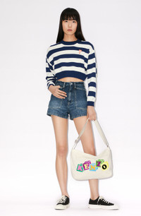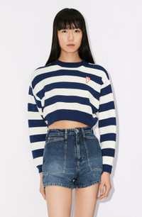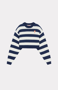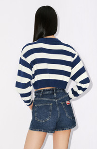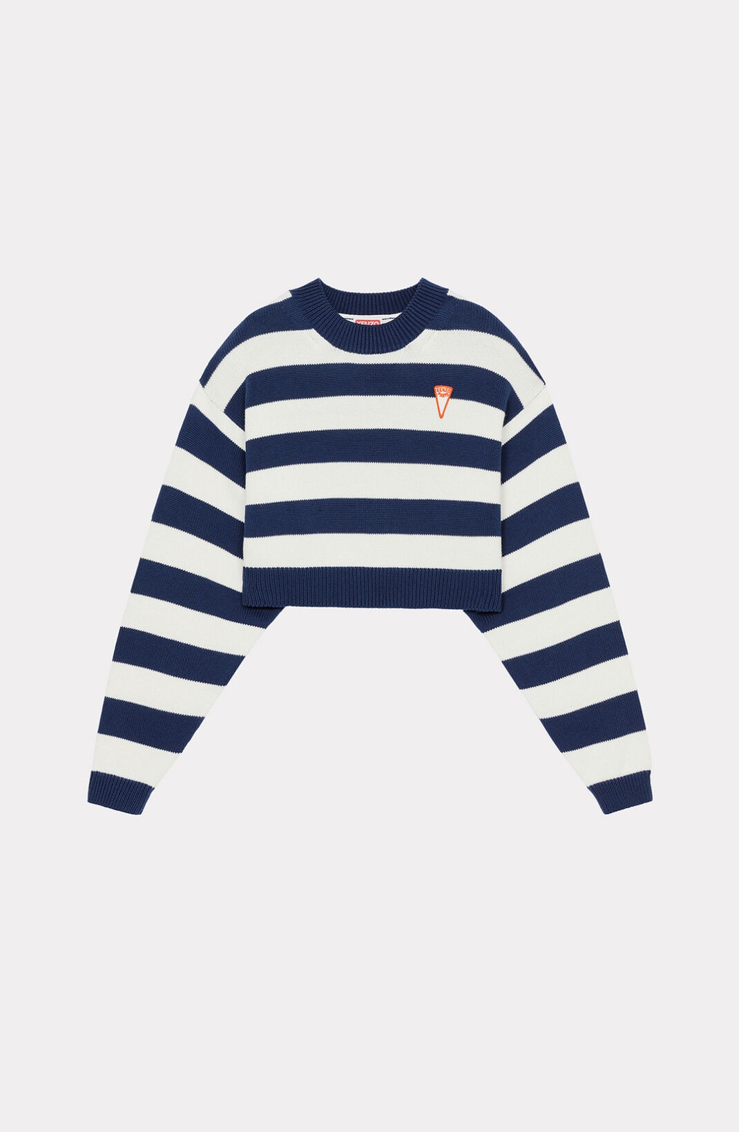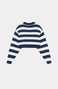 This jumper brings to mind the sailor-inspired designs that were so popular in 1980s Parisian fashion, presented here with a Japanese twist. It is signed with a KENZO Sera patch on the chest, inspired by nautical flags. The jacquard stripe motif goes perfectly with jean shorts, minimalist trainers and a canvas bag. Short long-sleeved jumper. Round neck. All-over jacquard stripes. 'KENZO Sera' patch embroidered on chest. Dropped shoulders. Ribbed finishes at the neckline and cuffs. COMPOSITION & CARE Made in Turkey 100% cotton
