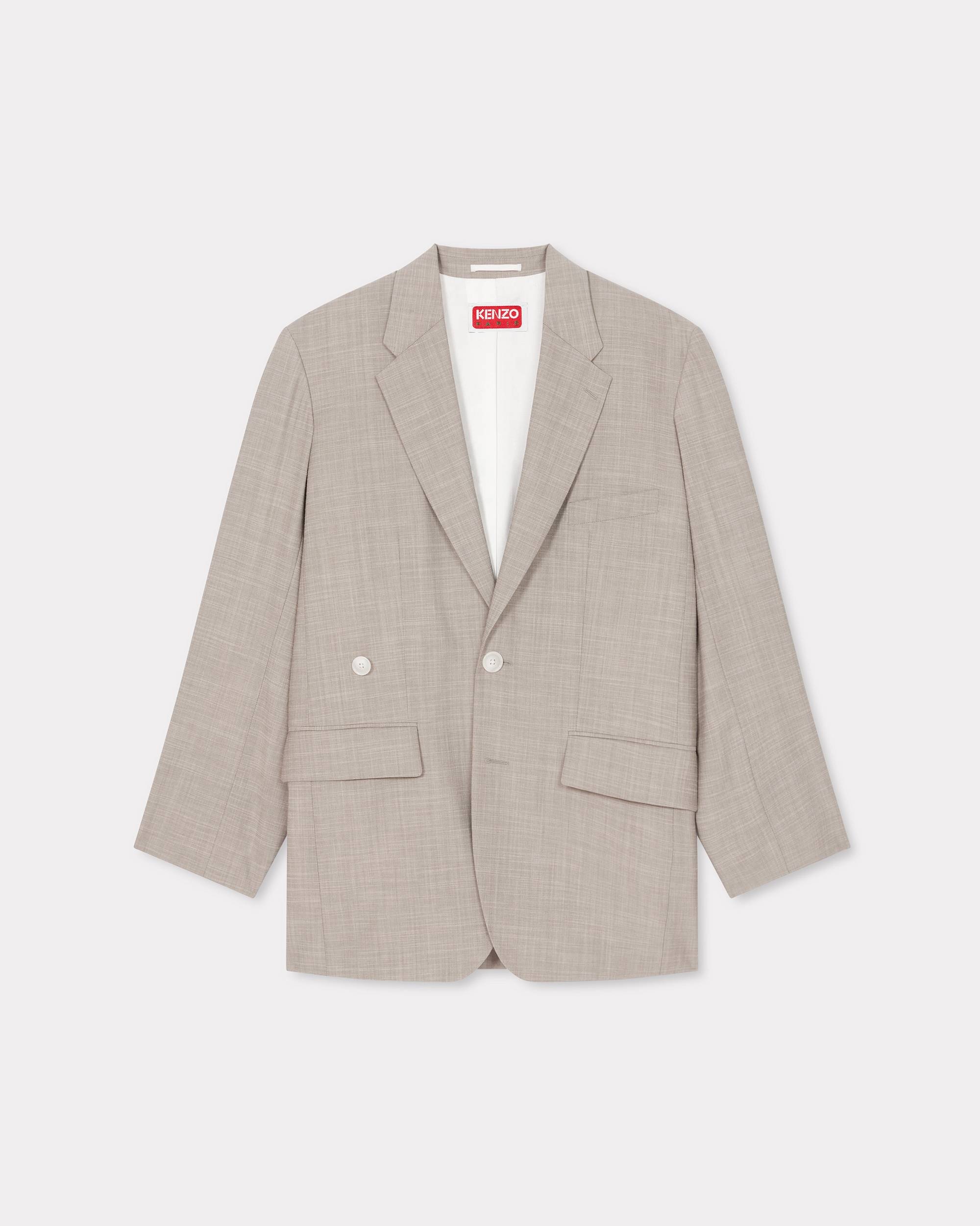 Oversized tailored jacket. Cool wool and white satin lining. Kimono sleeve detail at back. 2 jetted pockets and 1 welt pocket at chest. Two inside pockets with one with button closure. Cuff with 4 buttons and side vents. Blue 'Kenzo Paris' label at sleeve. Product Reference: FE52VE2469RB.96 SIZE & FIT Back length at 82 cm. Oversize cut. The model is 175 cm tall and wears a size S. COMPOSITION & CARE Made in Portugal 76% virgin wool, 23% cotton, 1% elastane Do not bleach Mild professional dry-cleaning in: hydrocarbons Iron at low temperature Line drying in the shade Do not tumble dry Do not wash Do not wet-clean