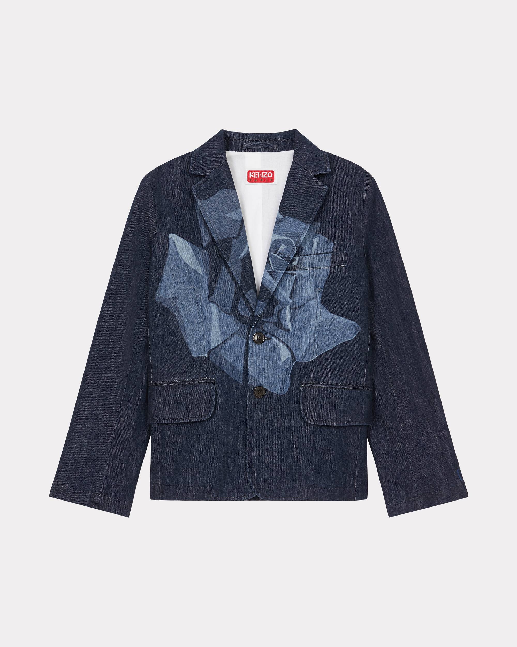 'KENZO Rose' denim talored jacket. Large laser 'Kenzo Rose' at front. Rinse blue carry over wash. Japanese denim. Tonal topstiches. 'Kenzo' white embroidery at back. 'Kenzo Paris' engraved buttons. SIZE & FIT Back length at 65 cm. The model is 175 cm tall and wears a size S. COMPOSITION & CARE Made in Portugal 100% cotton