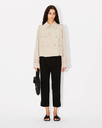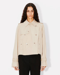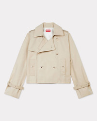 Short kimono trench. Cotton twill with satin lining. Kimono sleeve detail at back. Hook to close the collar. Shoulder tabs. Side pockets. Double-breasted closure. One inside pocket. Cuff straps. KENZO Paris label at back. Engraved buttons. Product Reference: FE62MA2189OI.11 SIZE & FIT The model is 175 cm tall and wears a size S. Back length at 55 cm. COMPOSITION & CARE Made in Bulgaria 64% cotton, 36% polyamide Do not bleach Mild professional dry-cleaning in: hydrocarbons Iron at low temperature Line drying in the shade Do not tumble dry Do not wash Do not wet-clean