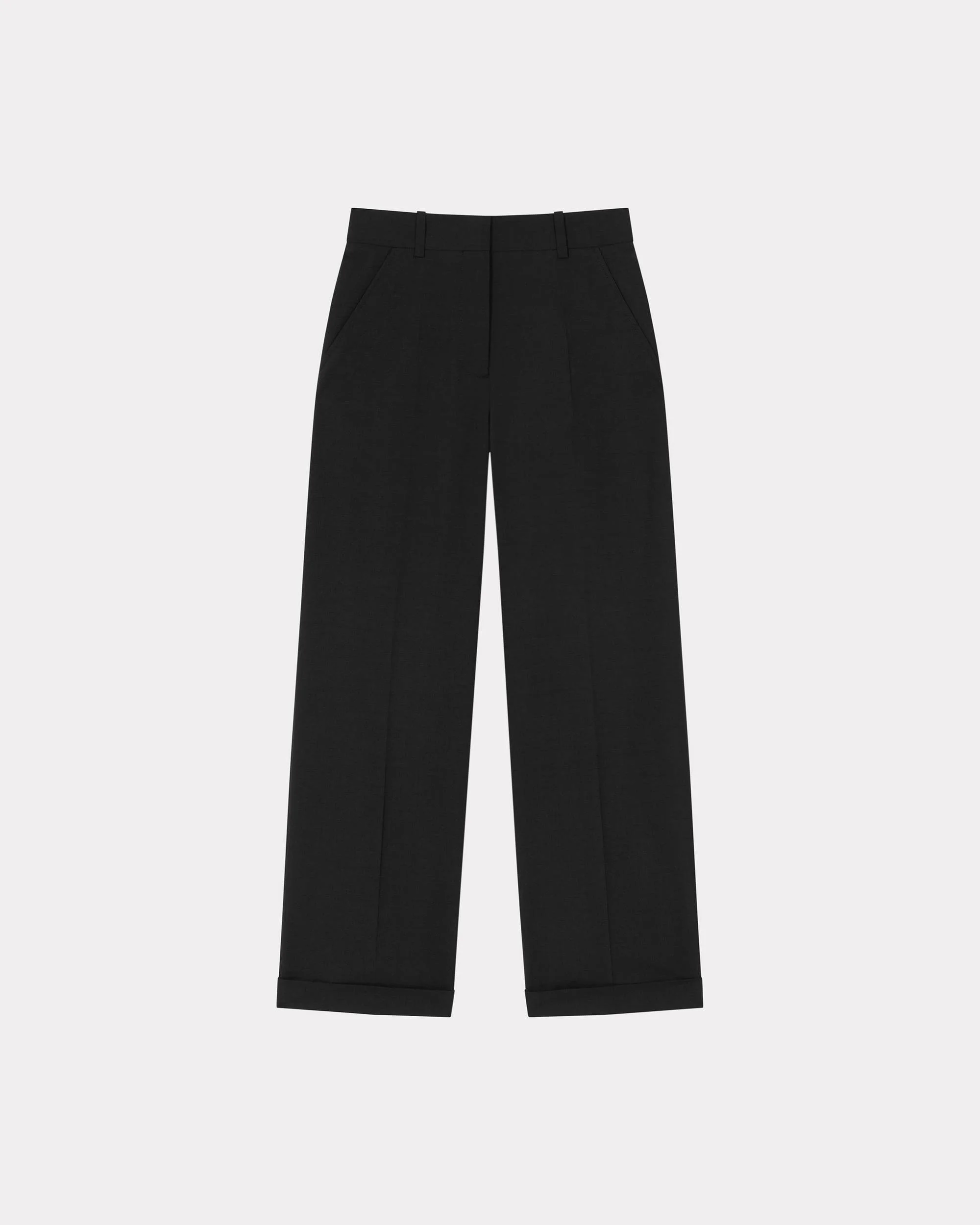 Cool wool tailored pants. Regular waist. Straight leg. Elongating front crease. Side pockets at front. Jetted pockets with flap at back. Basic belt loop with two crossed loops at back. Cuffs and hidden zip & button closure. Boke flower button. 'Kenzo Paris' label at back. Product Reference: FE52PA0869RB.99 SIZE & FIT Leg length at 103 cm. The model is 175 cm tall and wears a size S. COMPOSITION & CARE Made in Romania 76% virgin wool, 23% cotton, 1% elastane Do not bleach Mild professional dry-cleaning in: hydrocarbons Iron at low temperature Line drying in the shade Do not tumble dry Do not wash Do not wet-clean