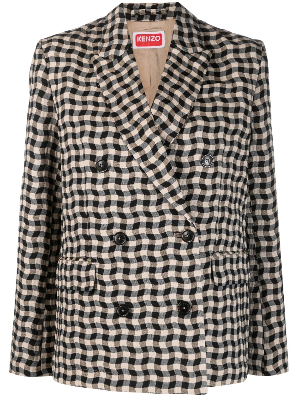 Wavy Check double-breasted blazer Creative director Nigo updates Kenzo Takada's audacious graphic style. The classic gingham check is transformed into a vibrant Wavy Check pattern in this double-breasted blazer. Highlights - Brown - Check print - Peak lapels - Double-breasted button fastening - Long sleeves - Buttoned cuffs - Chest welt pocket - Two side flap pockets Imported Composition Outer: Cotton 56%, Polyester 43%, Other fibres 1% Lining: Acetate 60%, Cupro 40% SIZE & FIT Model measurements Height 5 ft 10 in(1.79 m) Bust/Chest 31.49 in(80 cm) Hips 35.03 in(89 cm) Waist 23.62 in(60 cm) FittingInformation Designed for a boxy fit, intended for a loose fit throughout The internal drawstring at the hem allows for fitted preferences Made from a midweight non-stretch fabric This piece fits true to size – take your usual size
