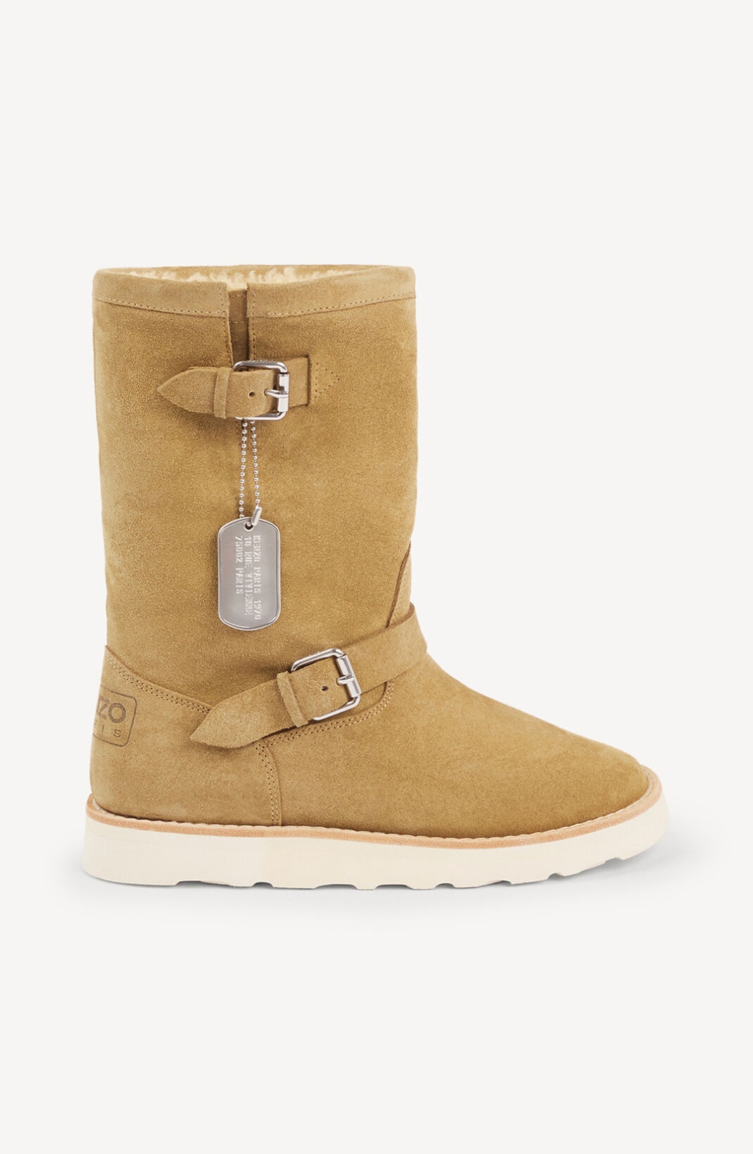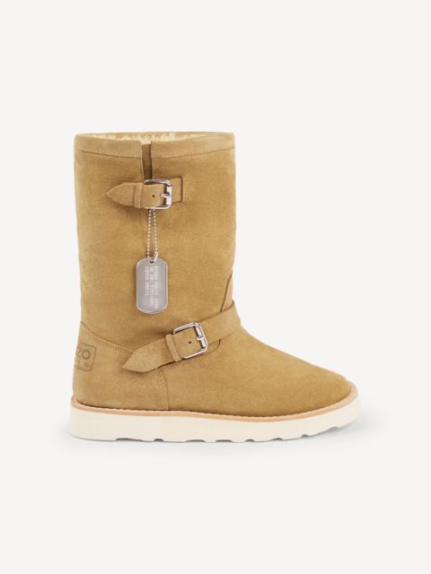 These suede KENZOCOZY boots take the classic codes of winter boots and offer them a new updated look. They are lined in sheepskin for warmth and comfort. The two buckles, military-style tag and embossed KENZO logo give them an original style. Suede leather boots. Embossed KENZO Paris logo at the back. Two metallic buckles. Sheepskin lined. Military-inspired tag. SIZE & FIT 3 cm sole. This model has a normal fit so choose your usual size. For half sizes, choose the one above. COMPOSITION & CARE Made in Portugal 100% split cow leather