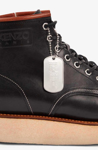 These leather ankle boots are the ultimate statement piece for an urban look. They boast many style details that make them stand out, from the hexagonal eyelets to the logo embossed at the ankle, the contrasting topstitching and the military-style tag. Vegetable tanned leather ankle boots. Military-style tag metal plaque. KENZO Paris logo embossed at the top of the boot. Wedge sole. Contrasting topstitching. Lace fastening with zip on the inside of the boot. SIZE & FIT Sole thickness: 3.5 cm. These boots offer a normal fit, choose your usual size. If in between two sizes, choose the one above. COMPOSITION & CARE Made in Spain 100% cow leather