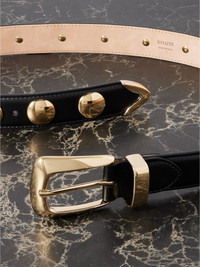 KHAITE's 'Benny' belt will tie together so many outfits. Made in Italy from soft leather, it's accented with gold-tone studs complementing the polished buckle and tips. Don’t save it just for jeans and pants – experiment by styling yours over midi dresses and coats too. Size & Fit - PS/S = sizes 70-80 - M/L = sizes 80-90 - Designed to be worn on the hips or waist - Measurements can be found in the link below Details & Care - Black leather (Calf) - Buckle fastening