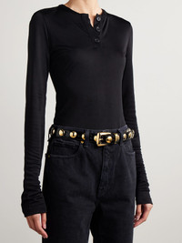 Khaite's 'Benny' belt will tie together so many outfits. It's made from black patent-leather and punctuated with gold-tone studs to match the buckle. Don't save it just for jeans and pants – experiment by styling yours over midi dresses and coats. Size & Fit - Designed to be worn on the hips or waist - Measurements can be found in the link below Details & Care - Black patent-leather (Calf) - Buckle fastening