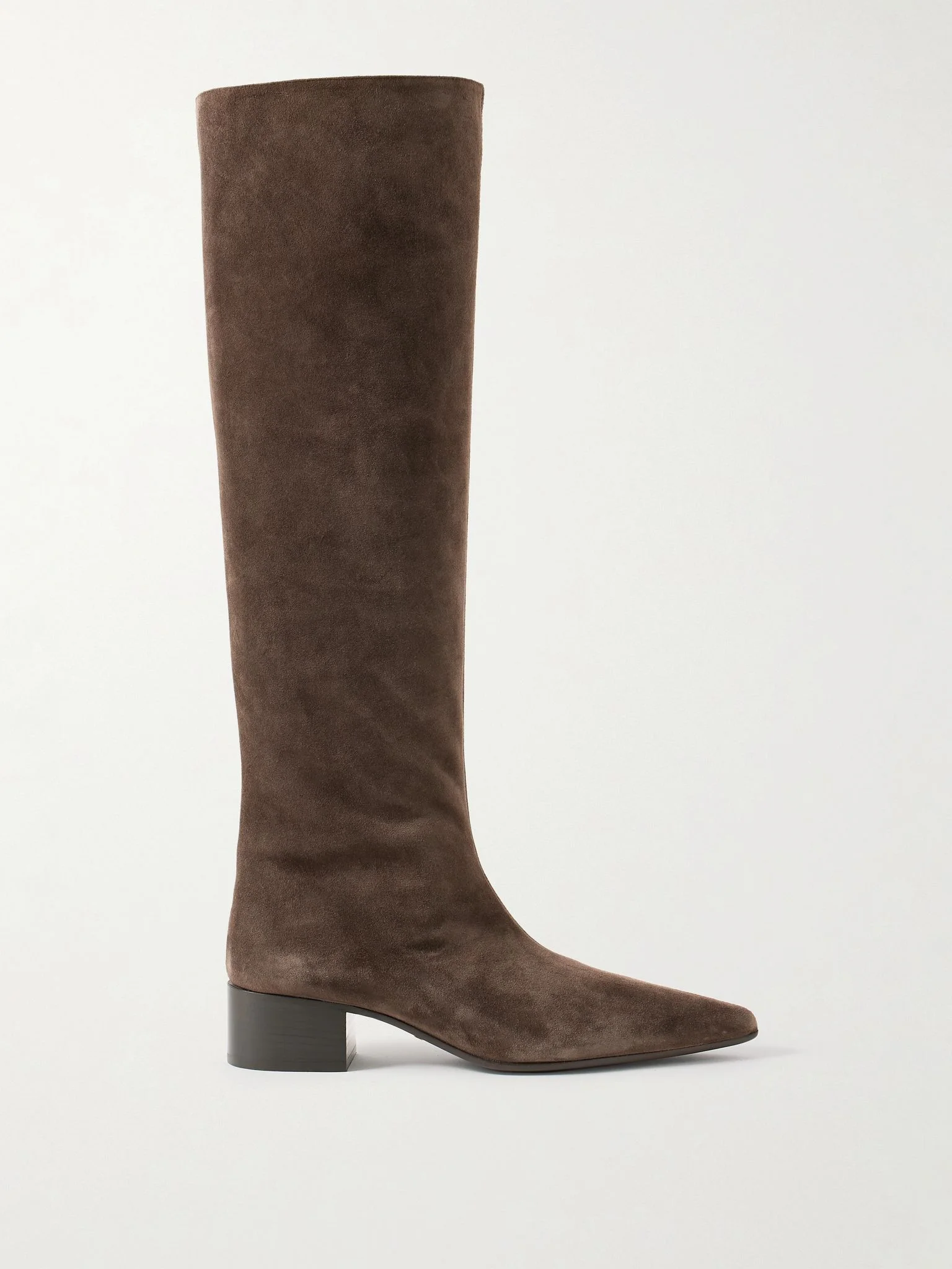 KHAITE's 'Andee' knee boots will be your go-to style in cooler weather. Crafted in Italy from suede, they have sharply pointed toes and rest on low block heels that offer a comfortable amount of lift. Show yours off with mini and midi hemlines. Size & Fit - Fits true to size, take your normal size - Italian sizing Details & Care - Heel measures approximately 40mm/ 1.5 inches - Brown suede (Calf) - Pull on